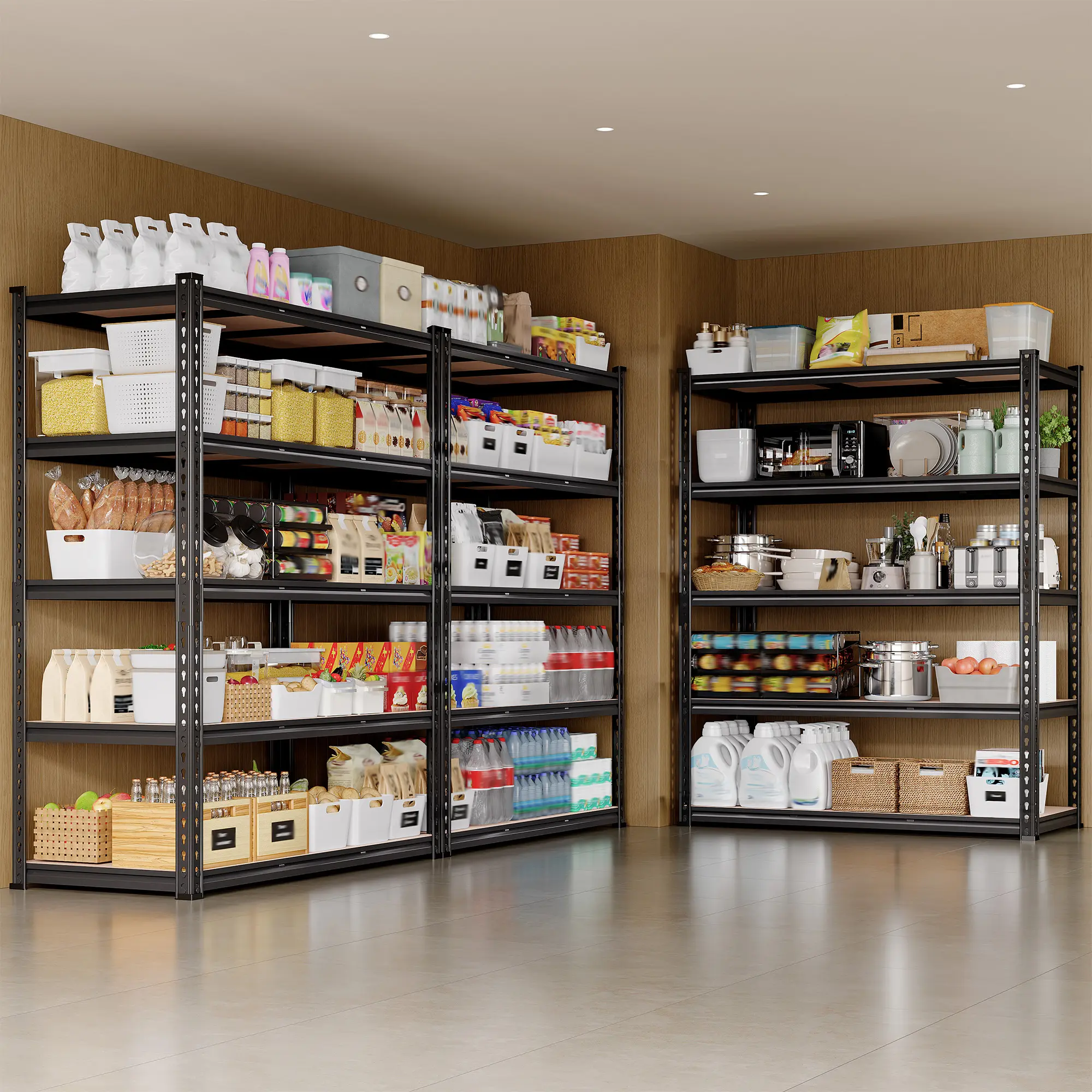 The shelf is in size of 48" wide,18" deep,and 60" tall. Perfect for garages, pantries, closets, kitchens, warehouses, basements, living rooms, offices, supermarkets, schools, and libraries. Expand your storage space and keep your home organized effortlessly.
