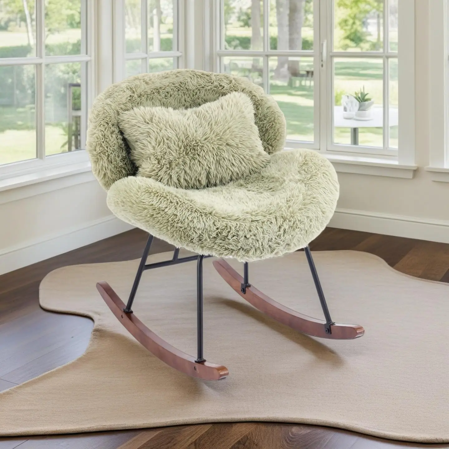 This nursing rocking chair seamlessly blends comfort, style, and functionality for the perfect nursery essential. Featuring a 25.6" extra-wide seat and an elegant eggshell-inspired curved design, it cradles you in a gentle hug, ensuring maximum comfort for relaxation, reading, or quiet moments—suitable for users of all body types and preferences. Wrapped in sumptuously soft teddy fleece and plush fabric, the skin-friendly upholstery mimics a warm embrace, creating a non-irritating haven ideal for late-night use. The armless design paired with a 95°-115° smooth-rocking motion eliminates spatial limits, letting you settle in effortlessly while the gentle rock soothes you. Built with a durable metal and wood frame supporting up to 330 lbs, it accommodates a wide range of users with its robust structure, while floor-protecting cotton pads ensure scratch-free gliding. Sleek black metal and natural wood accents blend with any decor, making it a versatile addition to various spaces. Complete with a removable plush pillow (10.6"W x 4.3"T x 16.1"L), it offers extra lumbar support, ergonomic angles, and security during rest—catering to diverse comfort needs. This chair isn't just a nursing seat—it's a cozy, stylish centerpiece that turns every moment into a warm, stress-melting experience for anyone seeking both comfort and functionality.