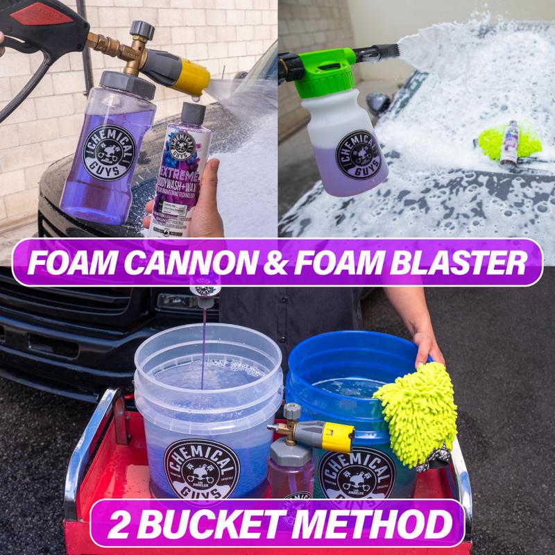 Mix 1–3 oz in a 32 oz solution tank. Spray thick foam over the vehicle, let dwell, rinse, and dry. Safe for use with foam cannons and pressure washers.