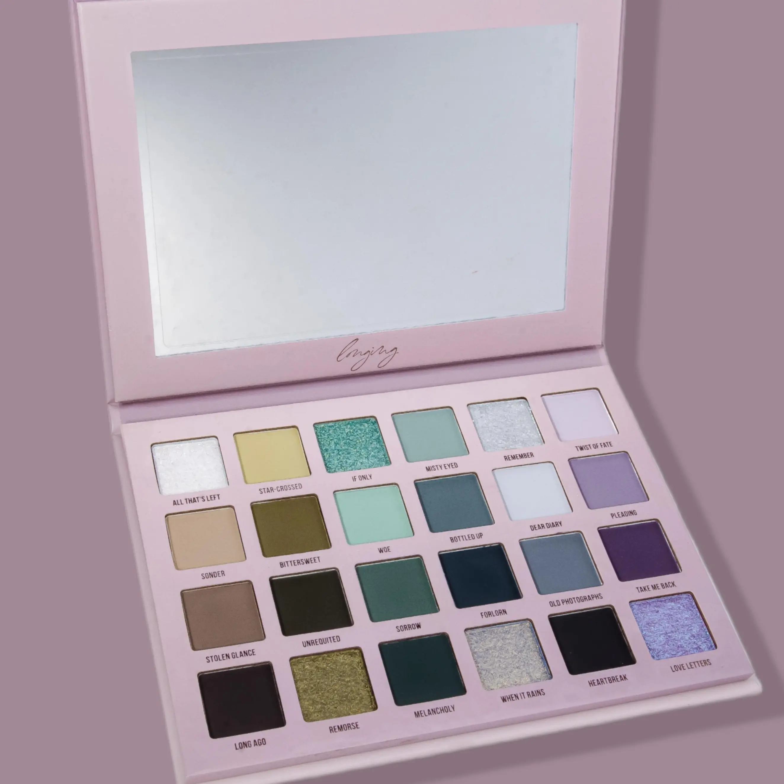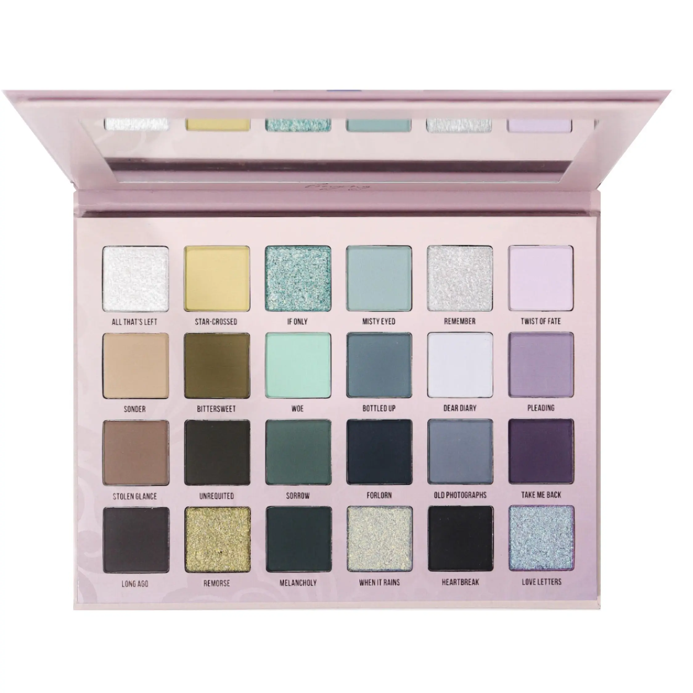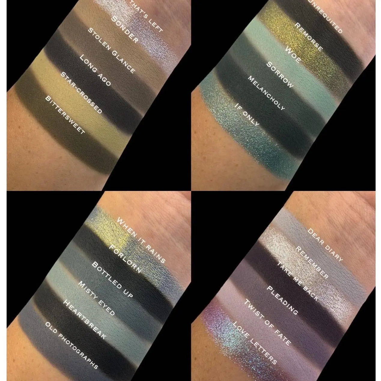 | Ingredients | EYESHADOW INGREDIENT: ALL THAT'S LEFT,STAR-CROSSED,IF ONLY,MISTY EYED,REMEMBER,SONDER,BITTERSWEET,WOE,BOTTLED UP,STOLEN GLANCE,UNREQUITED,SORROW,FORLORN,LONG AGO,MELANCHOLY,HEARTBREAK) TALC,MICA,CALCIUM SODIUM BOROSILICATE,CAPRYLIC/CAPRIC TRIGLYCERIDE,SILICA,DIMETHICONE,ETHYLHEXYL PALMITATE,POLYISOBUTENE,MAGNESIUM STEARATE,TRIETHOXYCAPRYLYLSILANE,BIS-DIGLYCERYL POLYACYLADIPATE-2,CALCIUM ALUMINUM BOROSILICATE,TRIDECYL TRIMELLITATE,SYNTHETIC FLUORPHLOGOPITE,PHENOXYETHANOL,DIMETHICONE/VINYL DIMETHICONE CROSSPOLYMER,ALUMINUM STARCH OCTENYLSUCCINATE,CAPRYLYL GLYCOL,TOCOPHERYL ACETATE,1,2-HEXANEDIOL,TIN OXIDE,ETHYLHEXYLGLYCERIN,POLYETHYLENE,MICROCRYSTALLINE WAX,PARAFFIN,METHICONE,TRIMETHYLSILOXYSILICATE,MAY CONTAIN(+/-):TITANIUM DIOXIDE(CI 77891),IRON OXIDES(CI 77499,Cl 77492,Cl 77491),D&C BLACK 2(CI 77266),FD & C BLUE 1 AL LAKE(CI 42090),FD & C YELLOW 5 AL LAKE(CI 19140),FERRIC AMMONIUM FERROCYANIDE(CI 77510),CHROMIUM OXIDE GREENS(CI 77288). FACE PIGMENT INGREDIENT: TWIST OF FATE,DEAR DIARY,PLEADING,OLD PHOTOGRAPHS,TAKE ME BACK,REMORSE,WHEN IT RAINS,LOVE LETTERS) TALC,BIS-DIGLYCERYL POLYACYLADIPATE-2,SYNTHETIC FLUORPHLOGOPITE,PHENOXYETHANOL. CALCIUM SODIUM BOROSILICATE,TRIMETHYLSILOXYSILICATE. MAY CONTAIN(+/-):TITANIUM DIOXIDE(CI 77891),CI 77491),ULTRAMARINES(CI 77007),D & C RED 27 AL LAKE(CI 45410),D&C BLACK 2 (CI 77266),D & C RED 7 CA LAKE(CI 15850),FERRIC AMMONIUM FERROCYANIDE(CI 77510). NOT FOR USE AROUND THE EYES. WARNING: FOR EXTERNA |