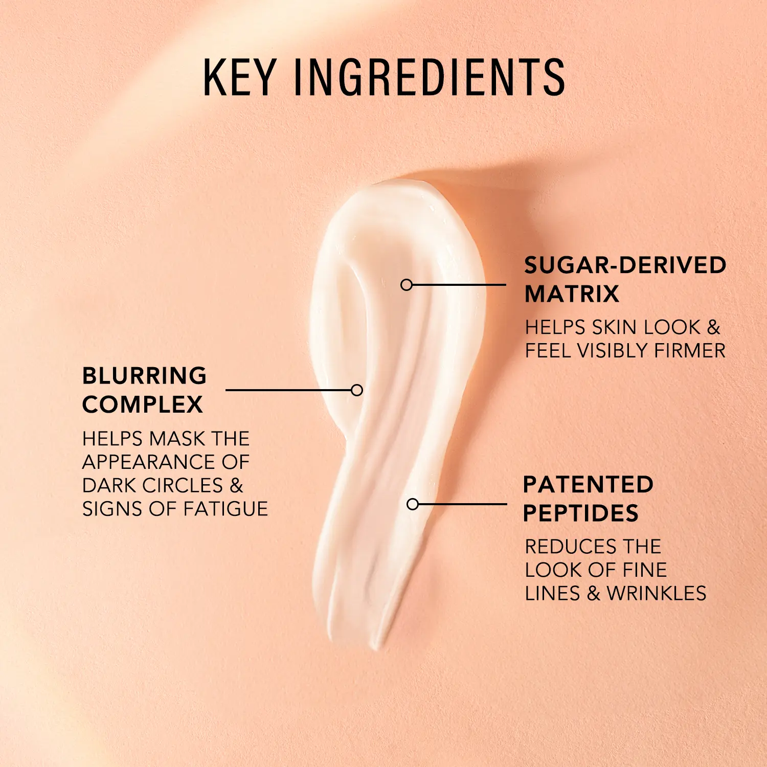 Because a showstopping life shouldn’t slow your glow, we’ve got a blurring complex for masking dark circles and a patented peptide sequence to improve the look of fine lines and wrinkles. Paired with a sugar-derived matrix that brings surface tightening and lifting you can feel immediately, you’ll see a boost in vitality, elasticity and luminosity. After all, you’ve earned it.