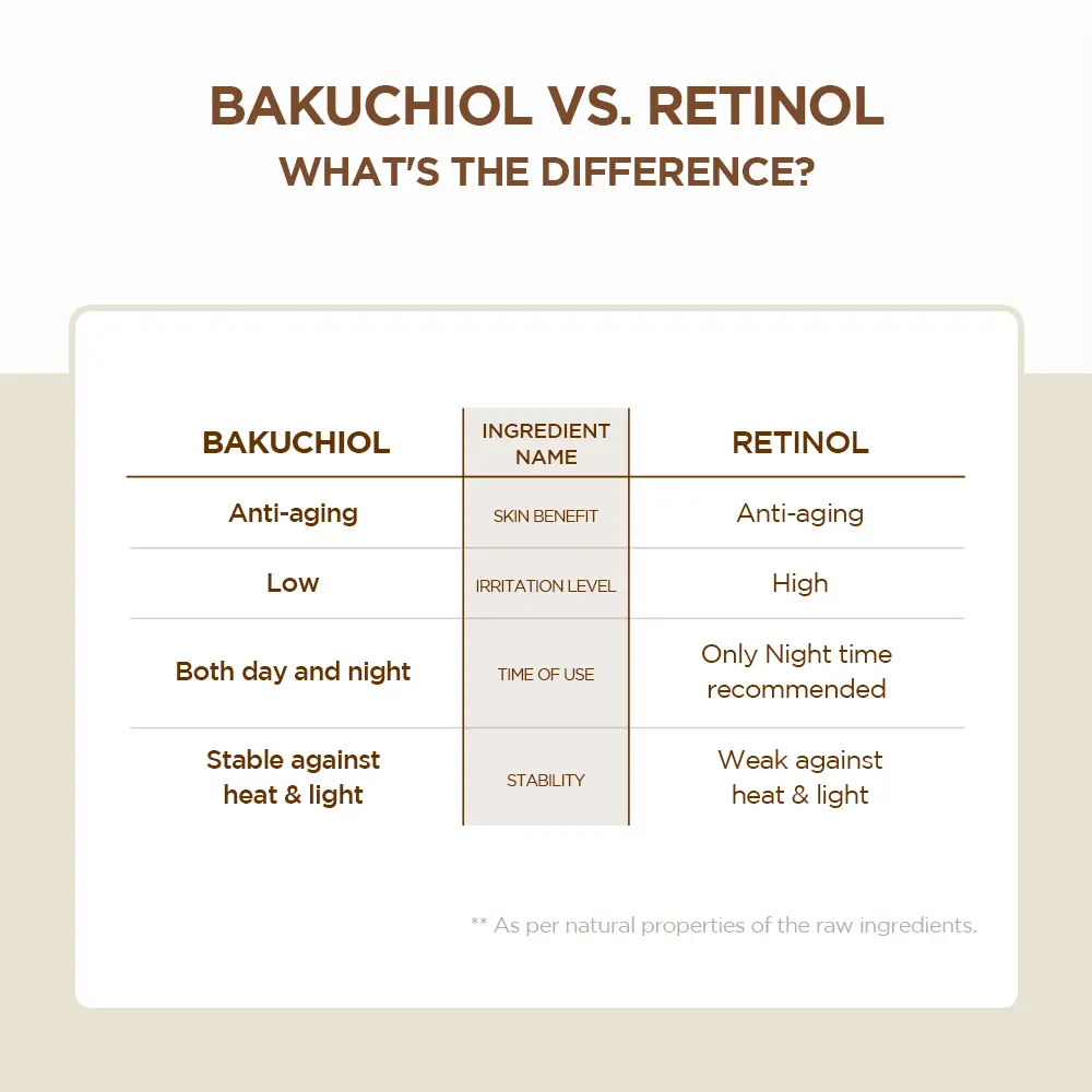 - Bakuchiol is a highly active ingredient extracted from Psoralea corylifolia seeds, and exhibits effects similar to retinol, but with less irritation, making it more suitable for daily anti-aging care without side effects from retinol use.