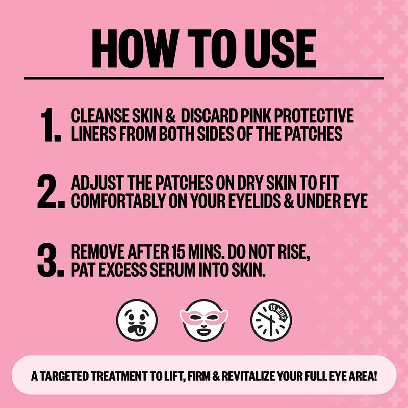 Our 360° eye lift patches work to counter droopy eyelids. A targeted treatment to lift, firm, and revitalize your full eye area. Biocellulose patches plump, brighten and help reduce the appearance of fine lines and wrinkles around the eyes with each use while boosting hydration for a natural glow. Expect instant results and long-lasting benefits for all skin types and all eye shapes.