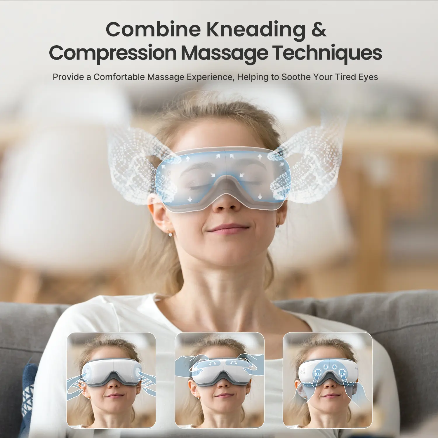 Evenly distributed air pressure massage around the eyes, accessing acupressure points to relieve eye pressure