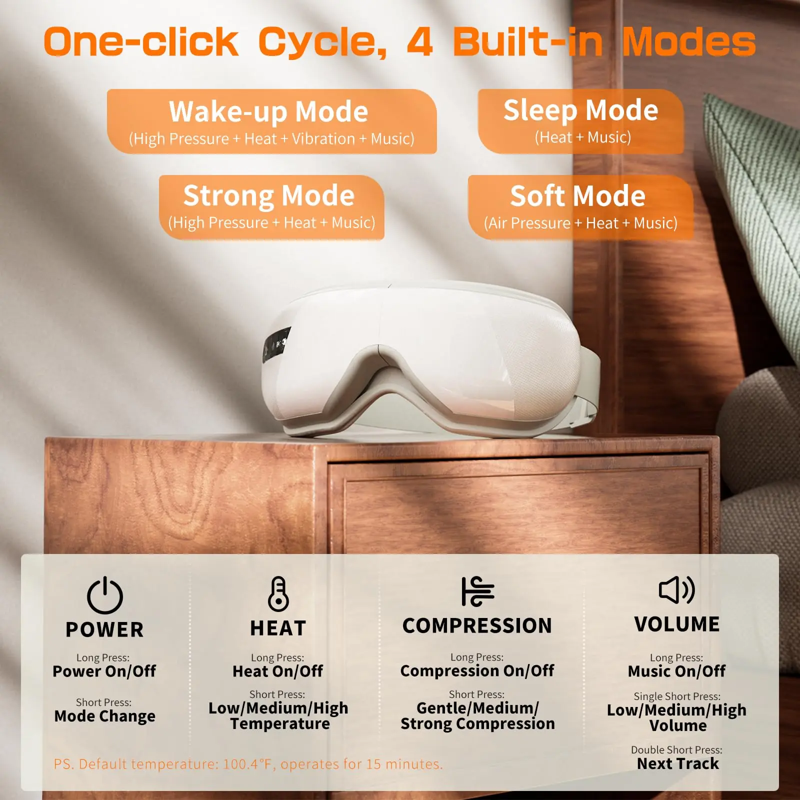 ·The massager provides three levels of heat—low, medium, and high—to help ease dryness and discomfort caused by eye strain. It also offers three pressure modes (light, medium, and strong) combined with acupoint massage techniques, delivering a deeply relaxing experience.