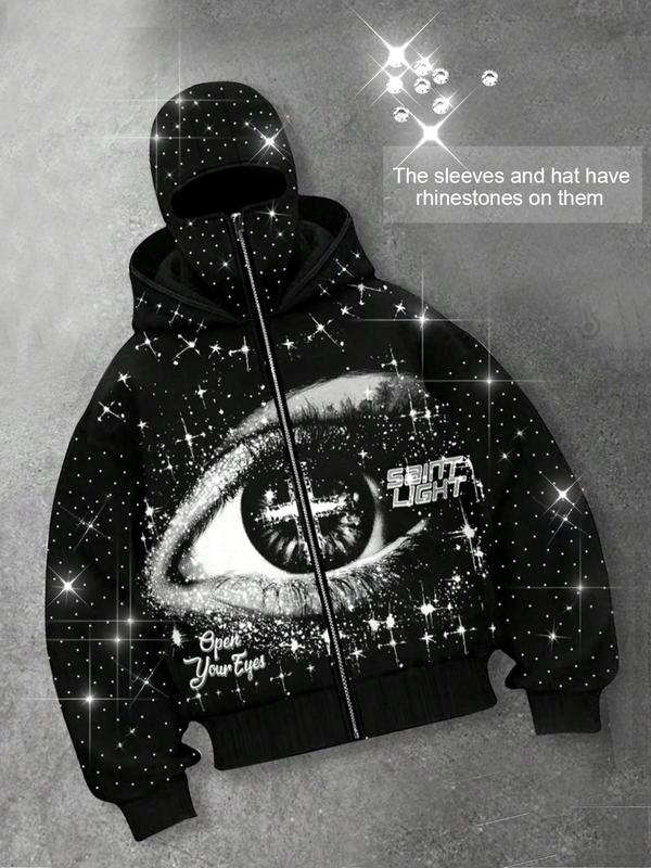 Eye pattern, two hats, zipper hoodie for men, sleeve hat with rhinestones, sparkling starry sky cardigan, hooded unisex hoodie, European and American street casual fashion trend jacket, autumn and winter velvet hoodie, party nightclub Instagram style