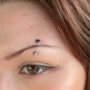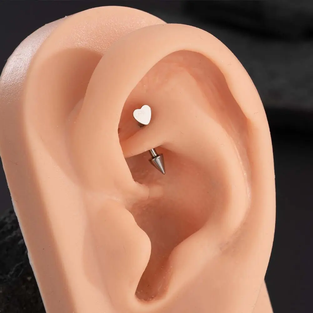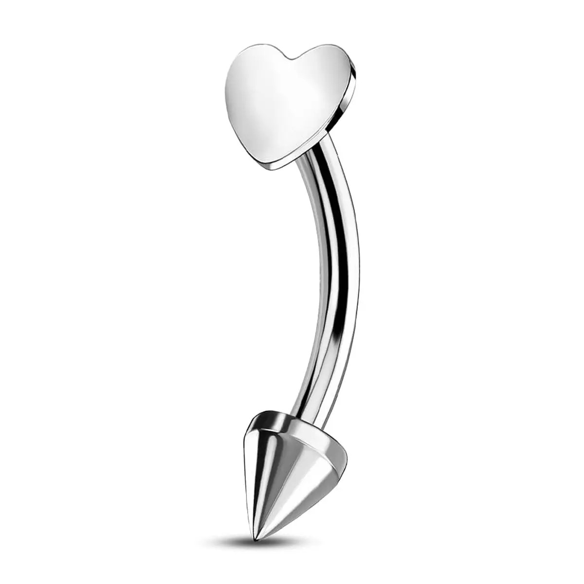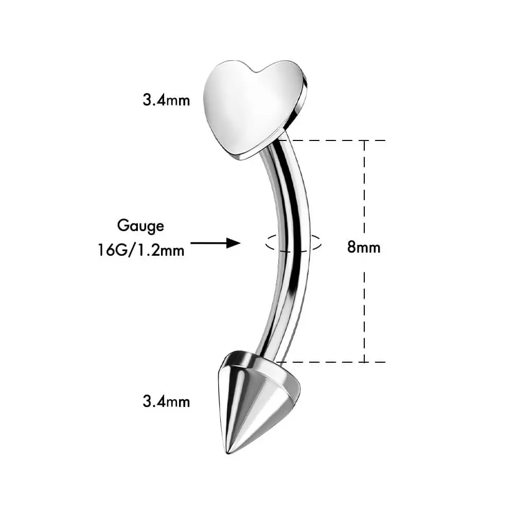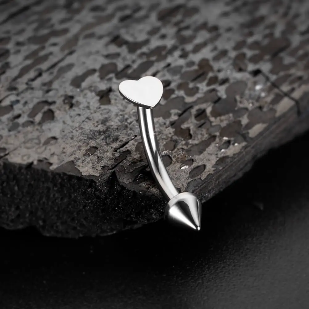 The spike eyebrow ring features a flat heart-shaped charm on one end and a spike accent on the other, adding a touch of edginess to its overall design. The heart shape brings a cute and playful element to the ring, while the spike adds a hint of attitude. It's made of ASTM F-136 titanium, which is not only durable but also hypoallergenic, making it suitable for those with sensitive skin.