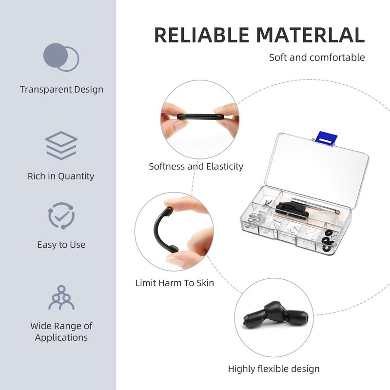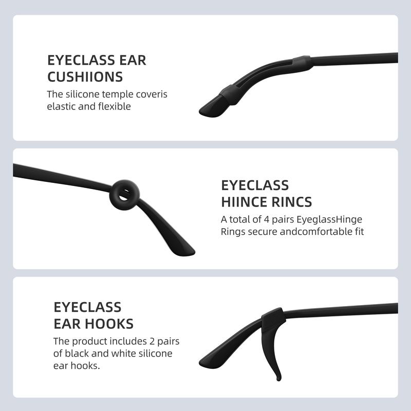 ·Ear & Temple Stabilizers8× Round Silicone Ear Grips: Lightweight grips to anchor glasses behind ears, perfect for preventing slippage during movement.4× Flexible Silicone Ear Hook Holders: Ergonomic hooks for intense activities (e.g., running, gym).4× Transparent Temple Tip Sleeves: Slip-resistant sleeves to repair cracked or loose temple ends.