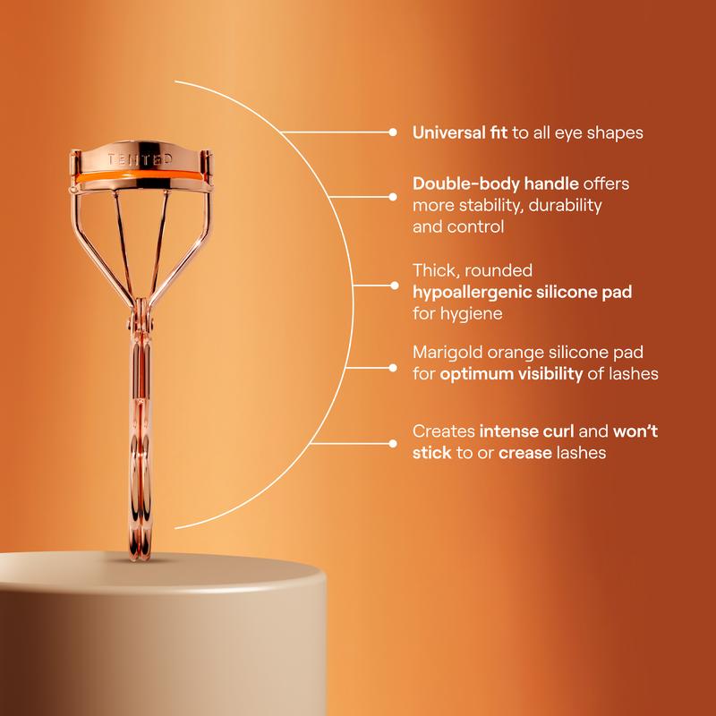Unlock the ultimate in lash lift. Expertly designed with a wide, curved shape to reach every lash, it delivers an eye-opening, glamorous curl for all eye shapes. Featuring a thick, rounded hypoallergenic silicone pad for optimal hygiene and a marigold orange color for enhanced lash visibility, this curler creates intense, crease-free curls without sticking to your lashes.