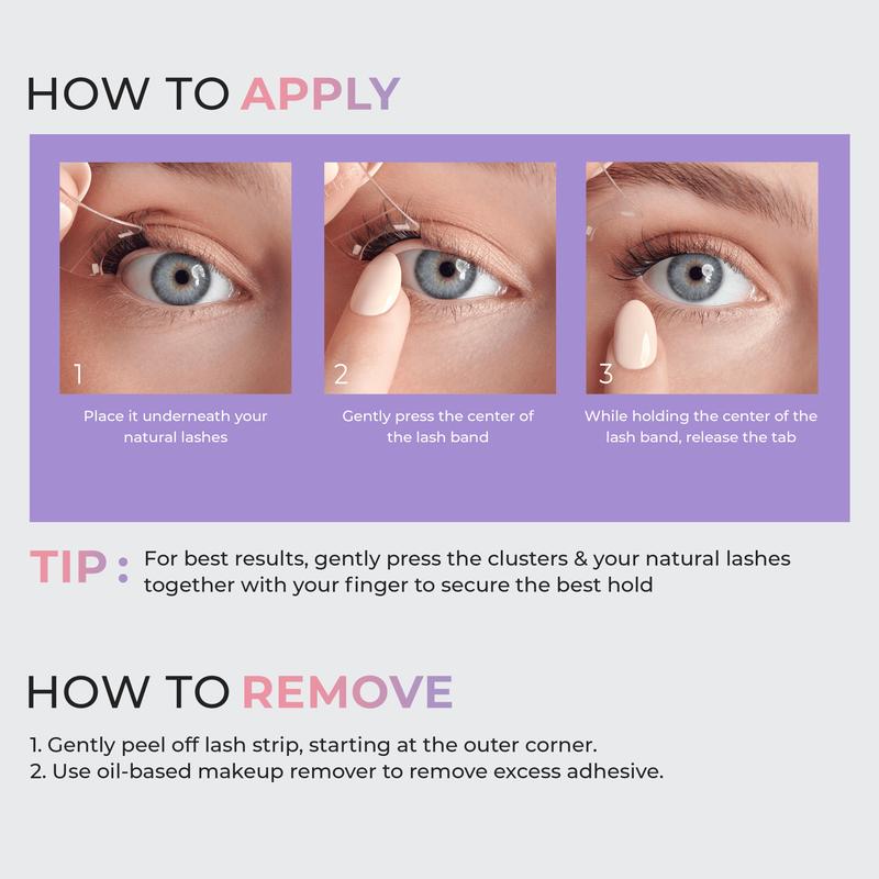 ·Innovative Easy Tab application lash clusters you place under your own lashes, for a seamless, natural look