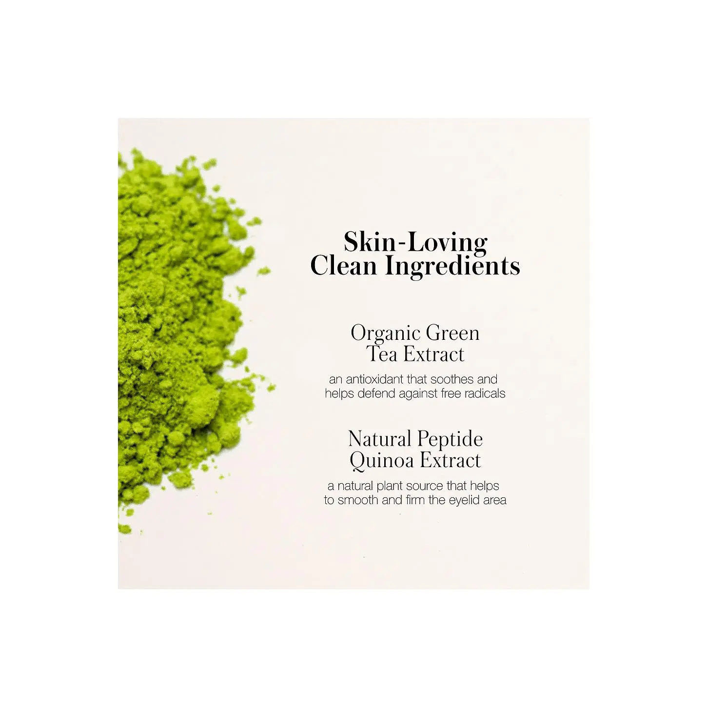 ·Natural Peptide Quinoa Extract is a natural and sustainable plant source, this innovative ingredient helps to smooth and firm the eyelid area