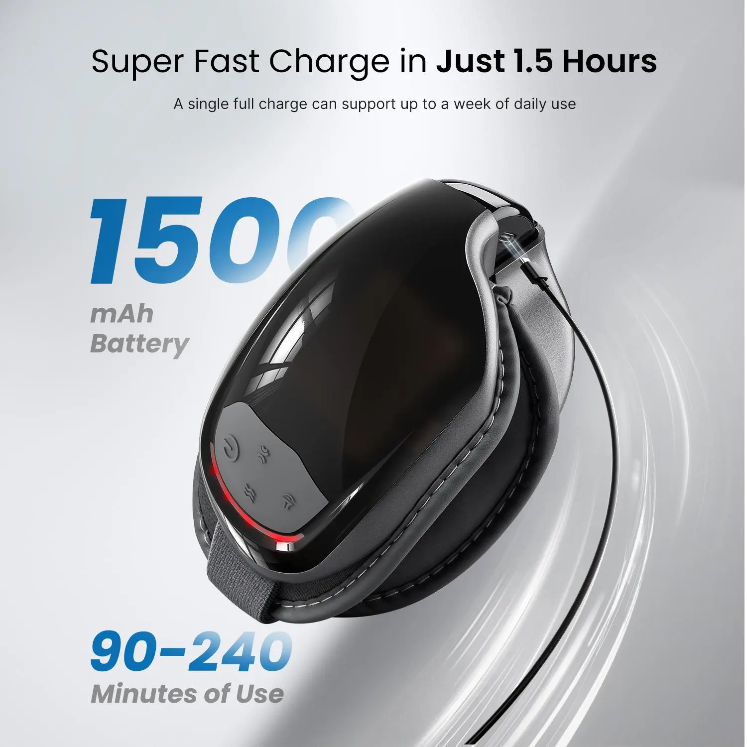 Fast Charging: The 1500mAh battery charges fully in just 1.5 hours with a red LED indicator showing the charging level.