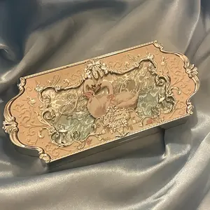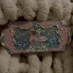 The packaging>>> I was so torn between the white and pink swan but I ordered the pink one and im NOT disappointed 🤭 all of the colors are INSANELY beautiful. And the shimmer on the right side of the pallet has my whole heart. If youre thinking about getting it- definitely get it<33