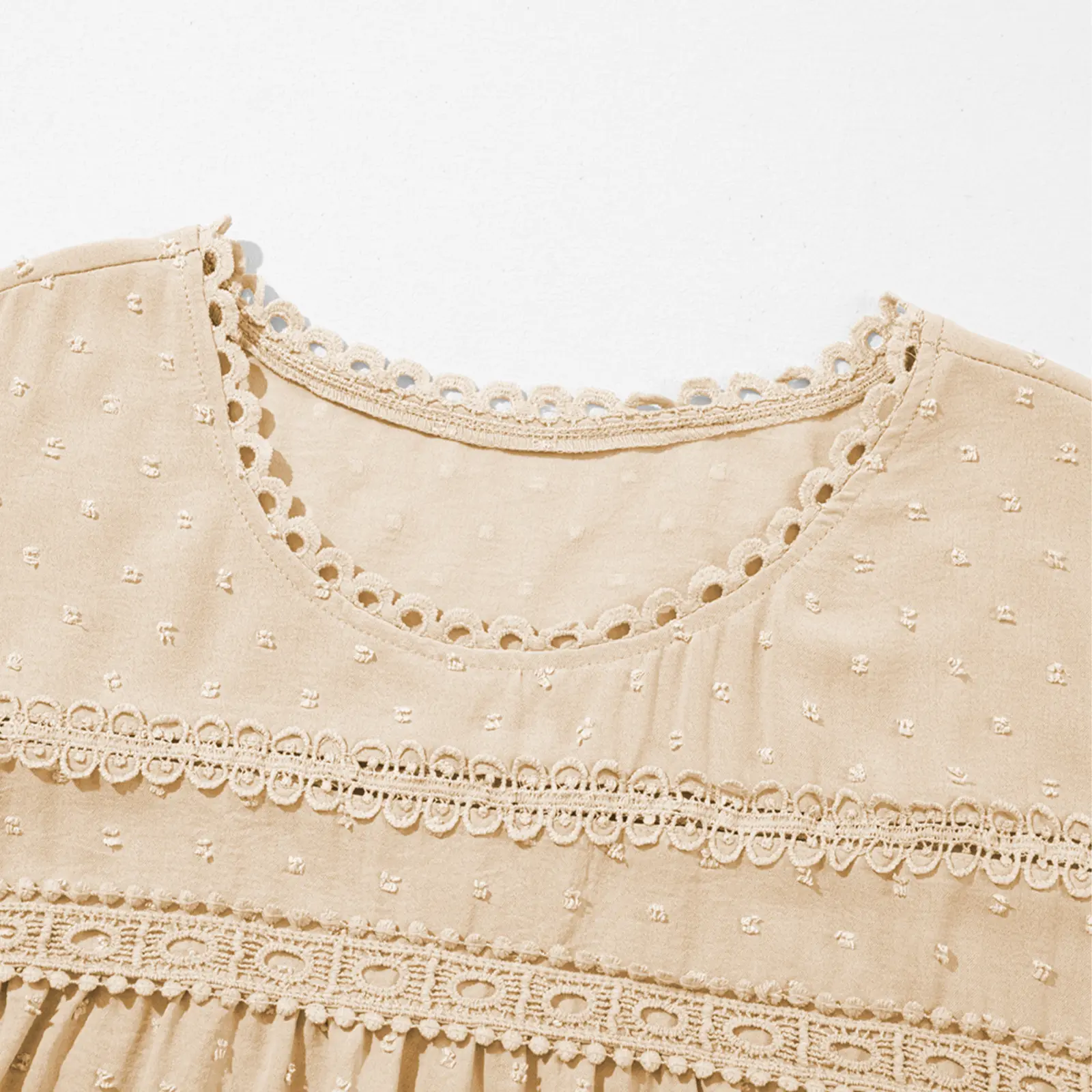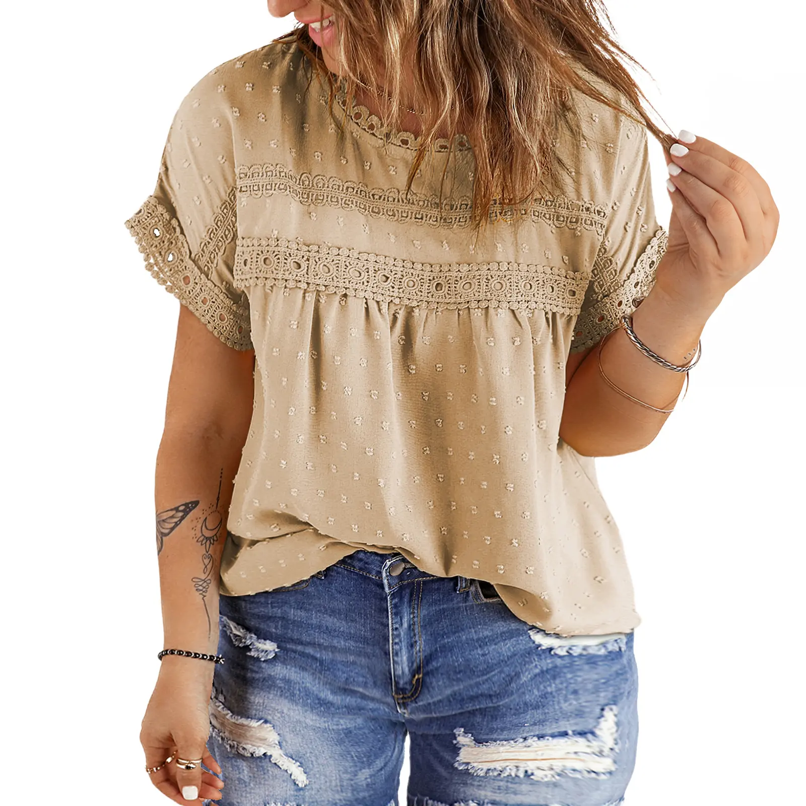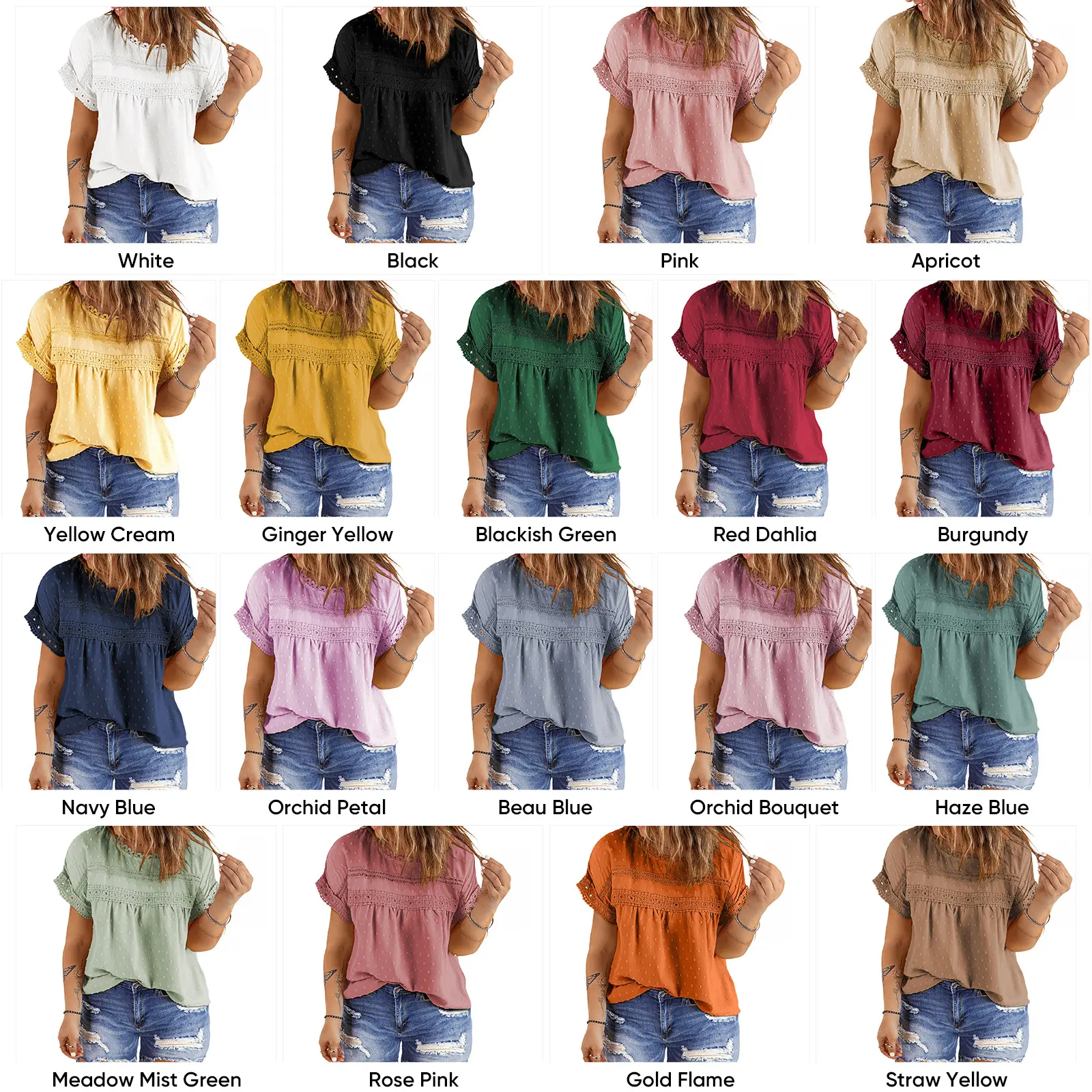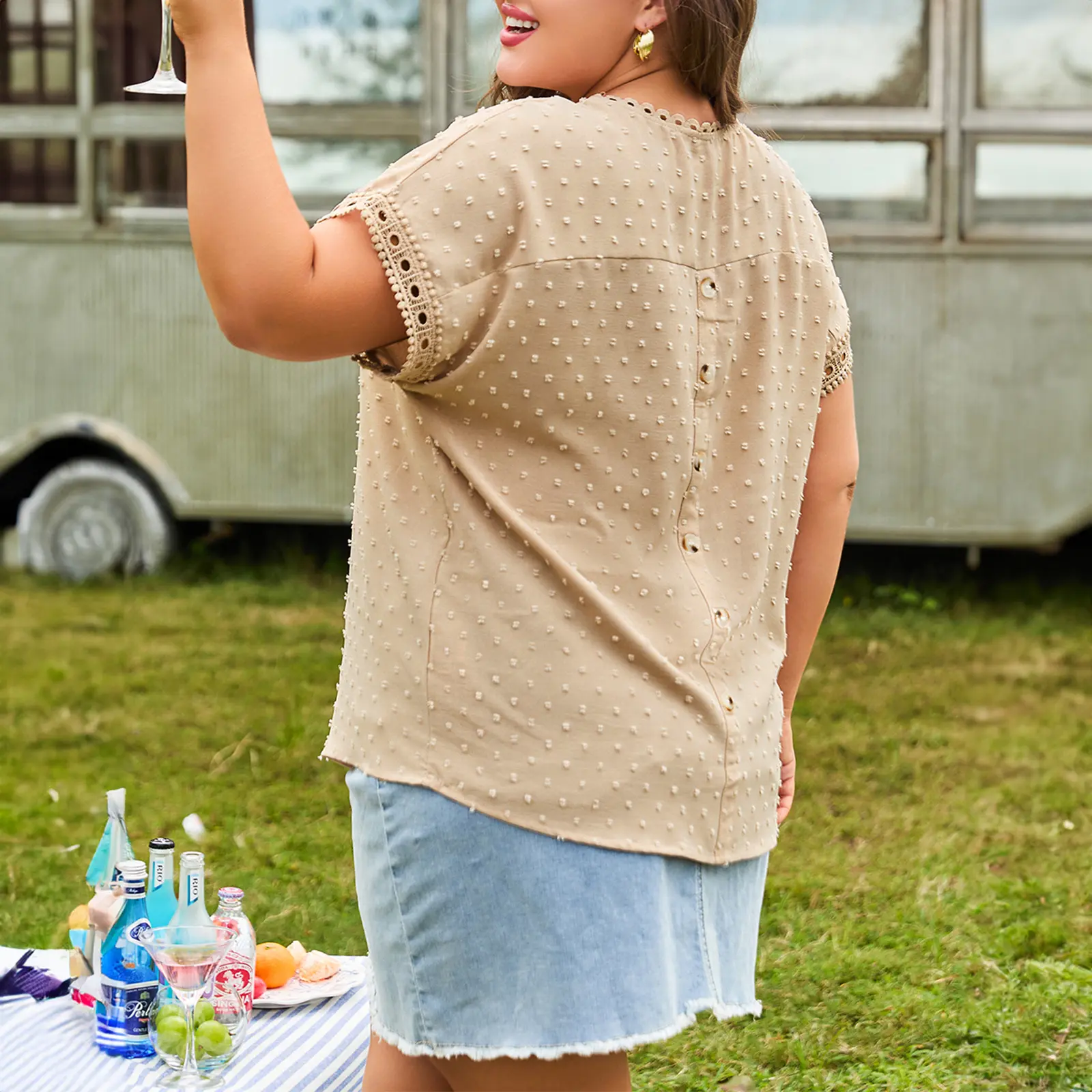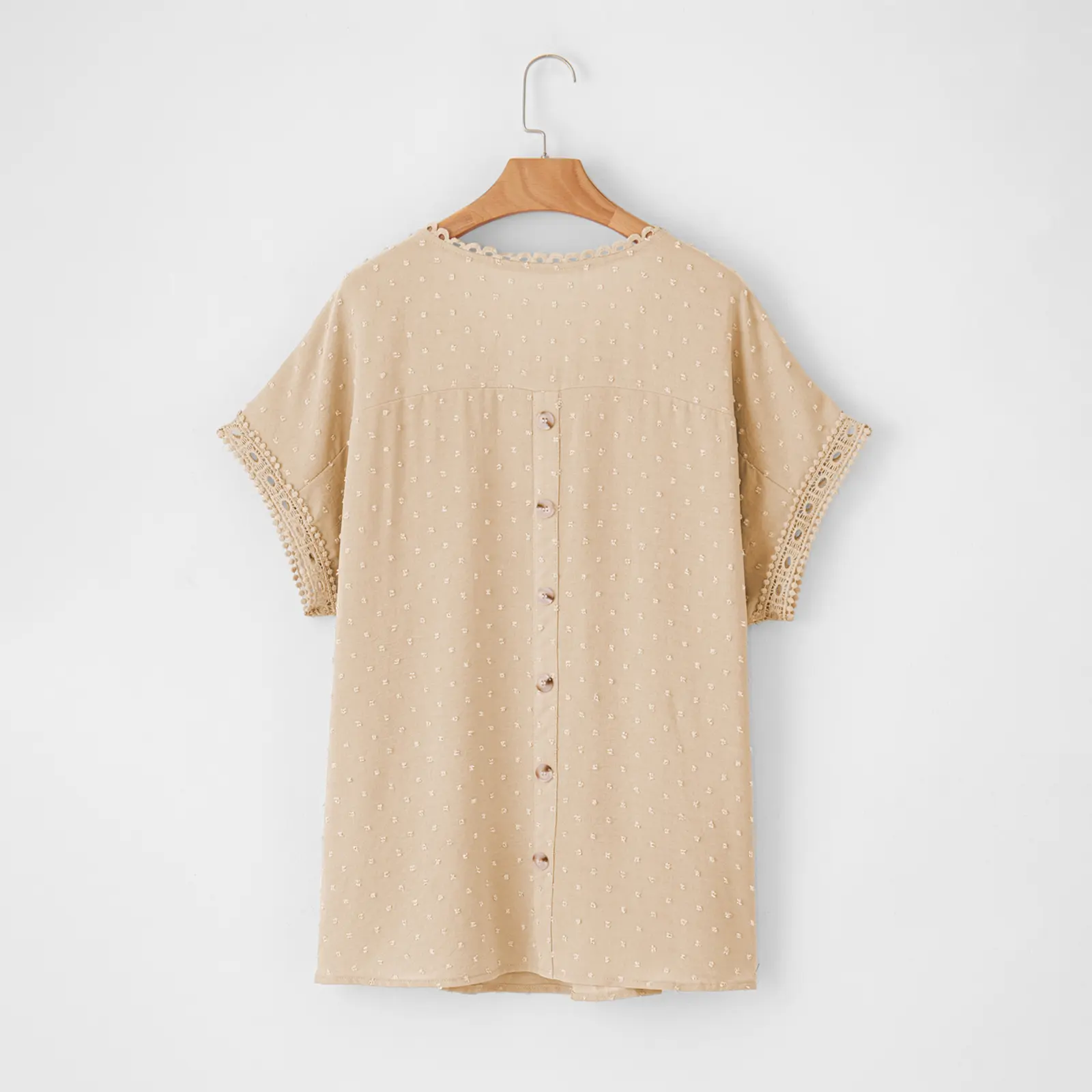 ·Feature: Plus size summer tops with crewneck,short sleeve,crochet lace edges,pom pom swiss dots detailing,solid color,back button down decoration,summer loose fit tops.