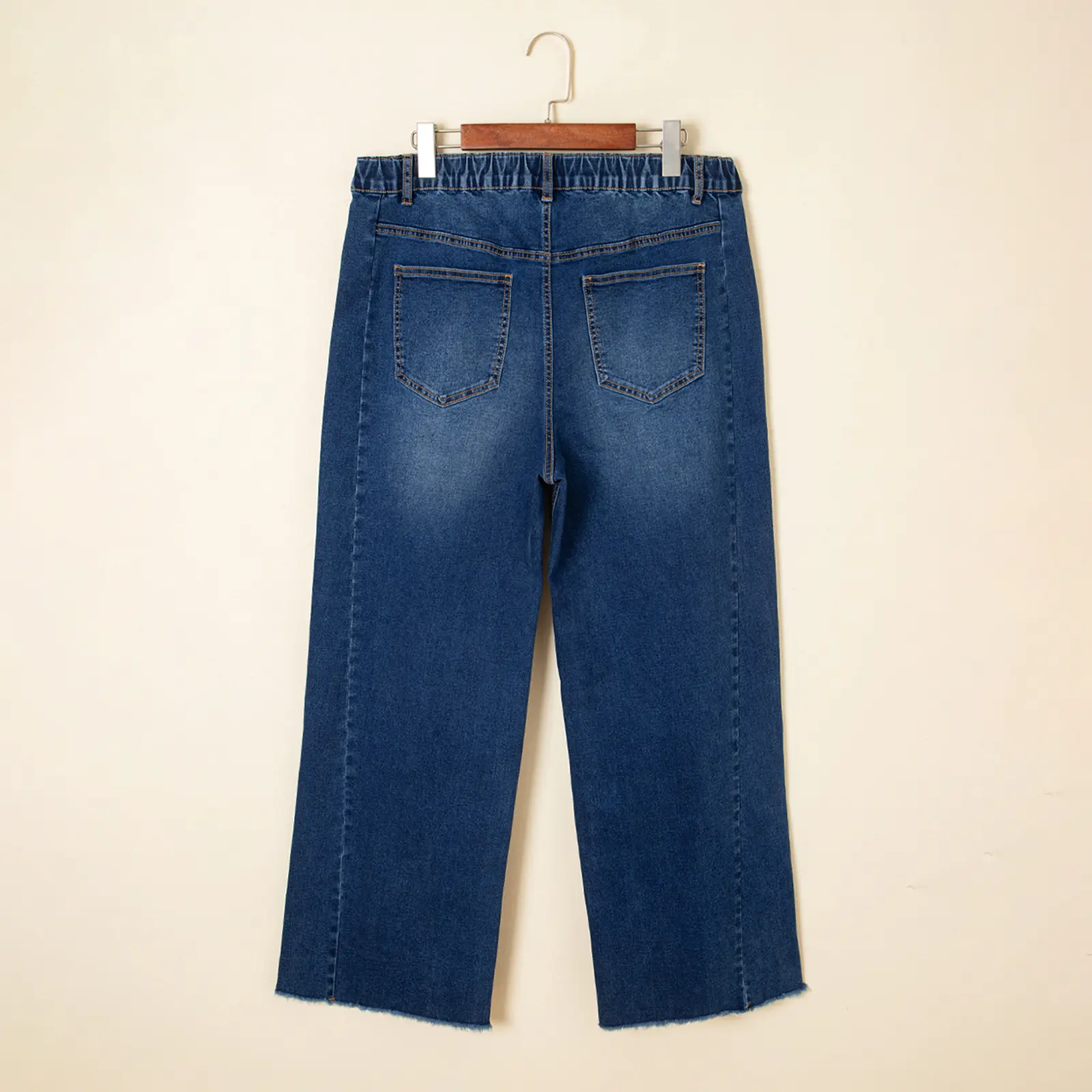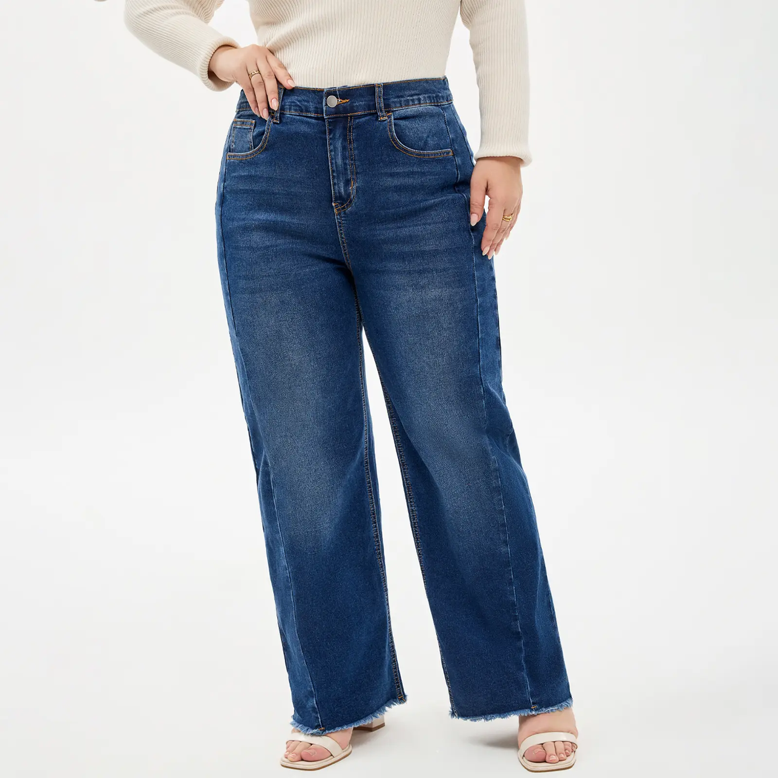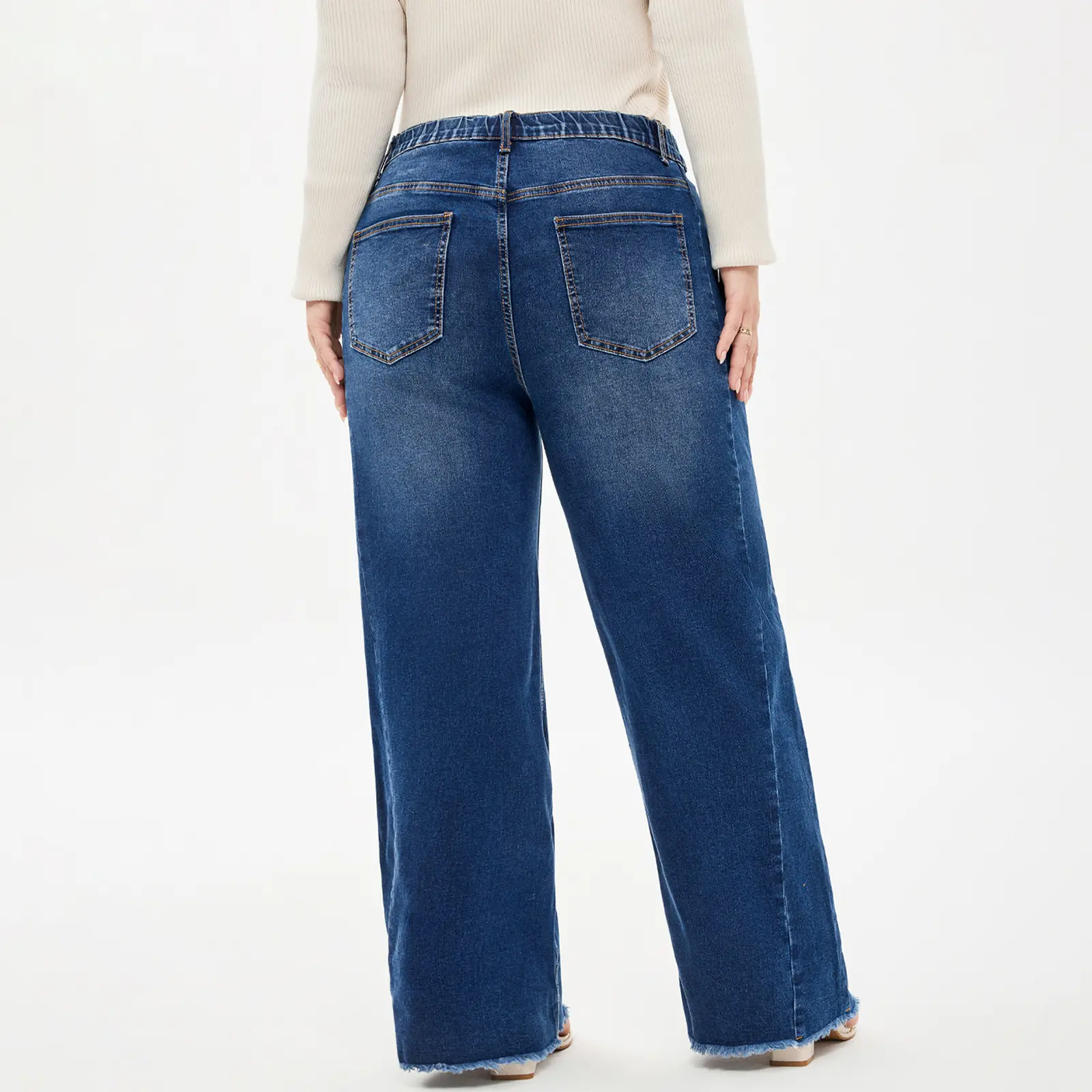 ·Design: Plus size wide leg jeans features elastic high waist, raw hem, side seam, loose fit, zipper and button closure, basic five pockets. Wide leg style can flatter a variety of leg types, providing ample room for movement and breathability
