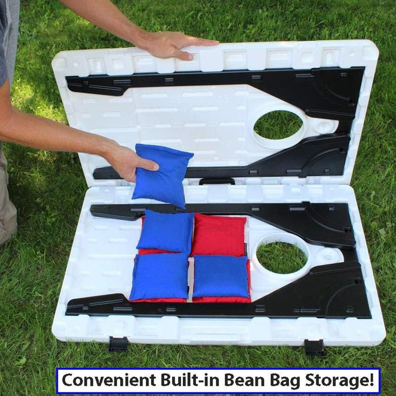 Ideal for on-the-go play, the boards, collapse to a compact size and snap together into a suitcase with integrated beanbag storage. Ready to play for all ages, the set includes 2 boards, 4 red beanbags, 4 blue beanbags, and a set of rules, everything you need for a fun-filled afternoon.