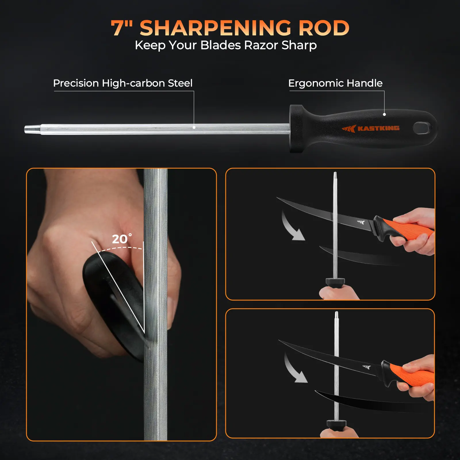 ·DURABLE FILLET KNIFE & CERAMIC SHARPENER: The 7" fillet knife is made from corrosion-resistant G4116 stainless steel, offering ideal flex and razor-sharp cuts. Its non-slip elastomer ergonomic handle ensures comfort and control. The fillet knife is designed with a lanyard hole for secure attachment. The included 7" sharpening rod helps you to maintain a sharp blade. Crafted from precision high-carbon steel with an ergonomic handle for durability and easy use