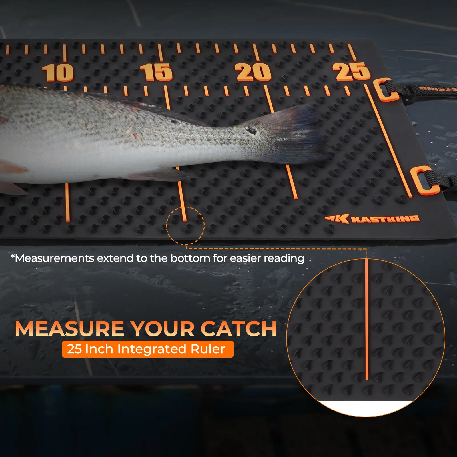 The 25" fish measuring board ensures quick, accurate measurements with clear markings for easy compliance.