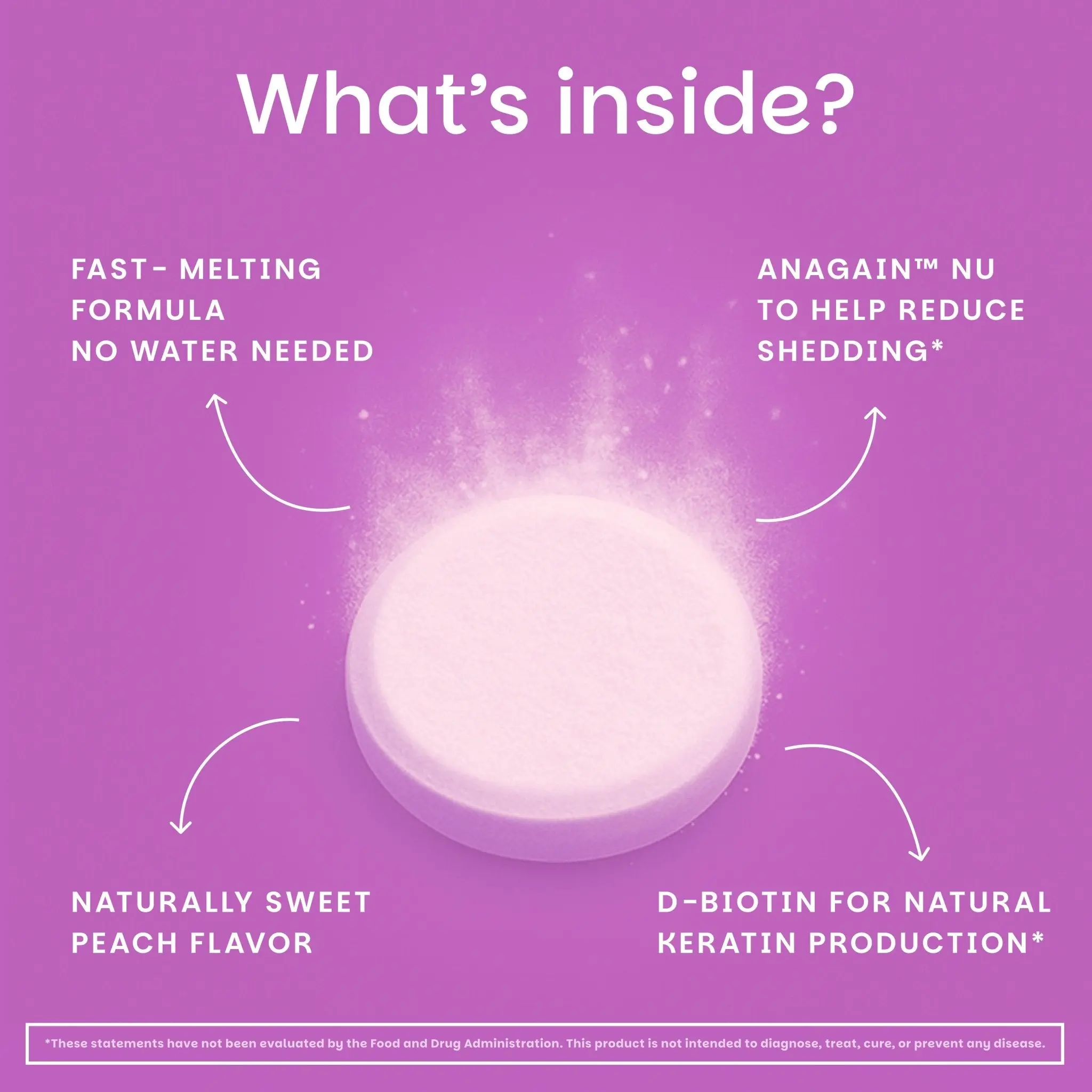 - Fast-Melting Tablets: Sugar-free nutrients for your hair that dissolve quickly in your mouth, with no water needed, making daily use simple, smooth, and stress-free