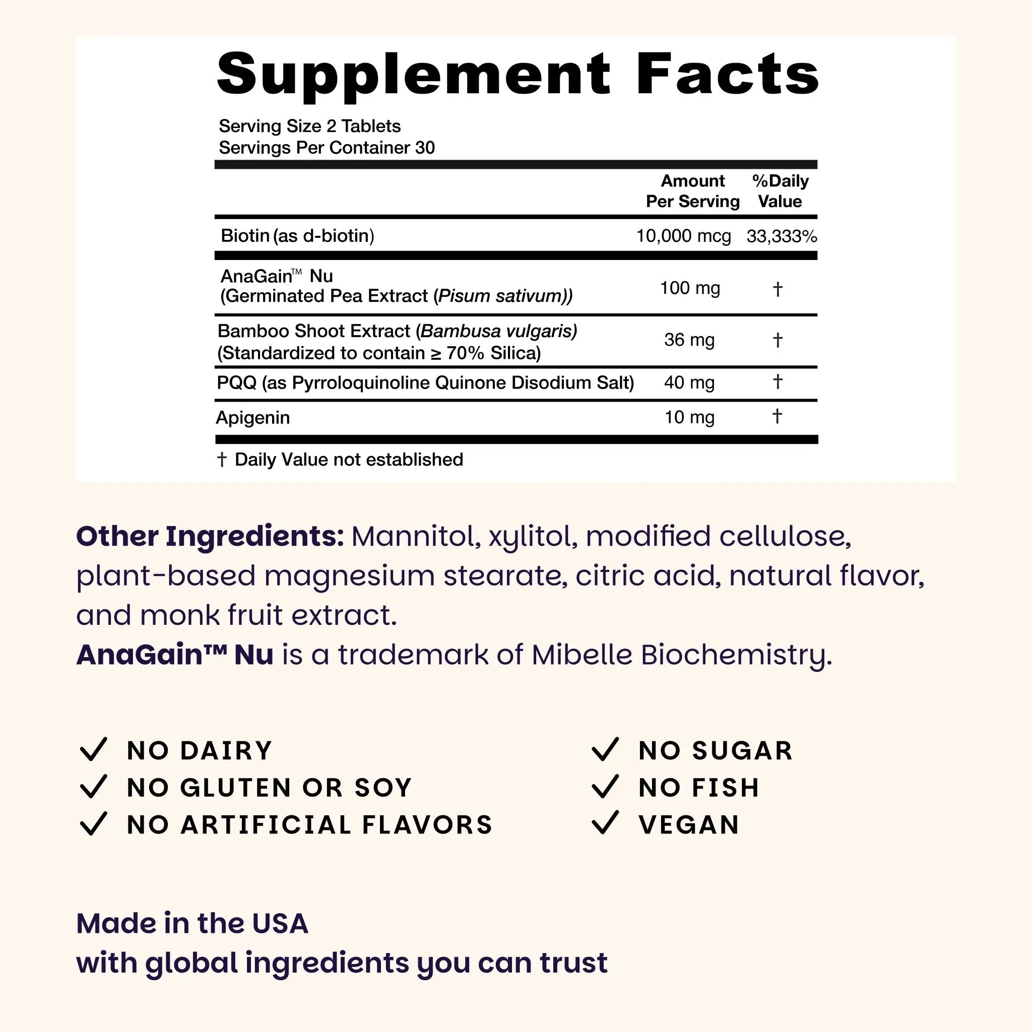 - Complete Hair Supplement: Also includes PQQ, bamboo shoot silica, and apigenin to support scalp health and shiny hair*