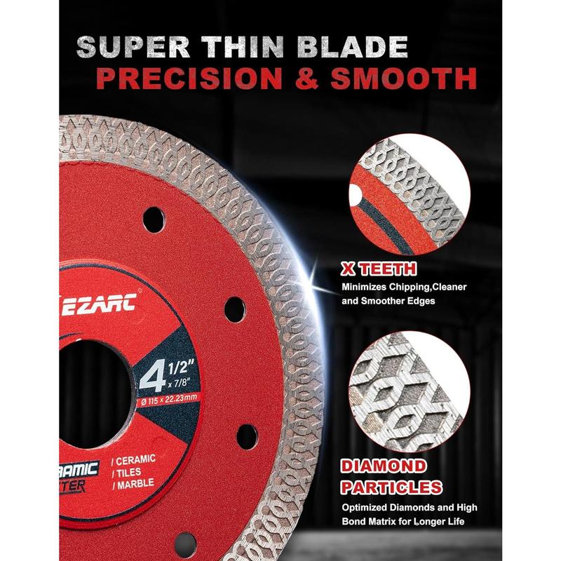 The super thin diamond blade is a specialized tile cutter, crafted for precise and clean cuts on various tile materials such as ceramic and porcelain. The turbo design minimizes chipping at the cutting edge, ensuring a smoother and cleaner finish. Meanwhile, the segmented diamond saw blade boosts cutting speeds by up to 30%, allowing for efficient material removal, shortening project timelines.