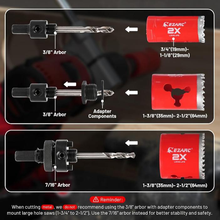 Includes 10 hole saw sizes—3/4", 7/8", 1", 1-1/8", 1-3/8", 1-1/2", 1-3/4", 2", 2-1/4", and 2-1/2"—with a cutting depth of 1.89" (48mm). Comes with 3/8" & 7/16" arbors, pilot drills, adapter nut, washer, and hex key.