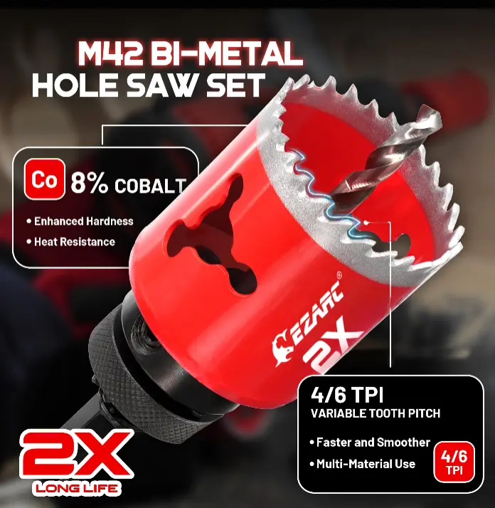Made from tough M42 bi-metal and 8% cobalt, this hole saw kit cuts through materials 30% faster and lasts up to twice as long as standard saws—perfect for tackling tough jobs with ease.