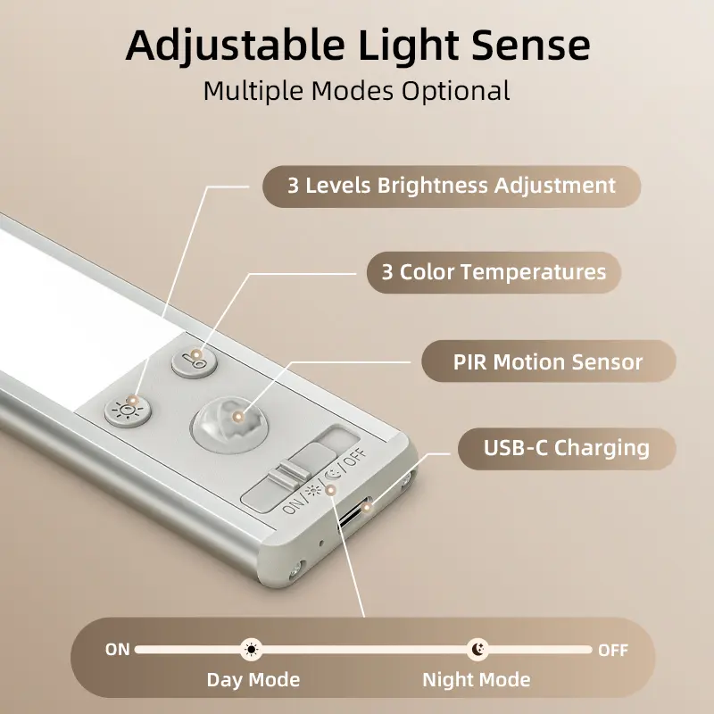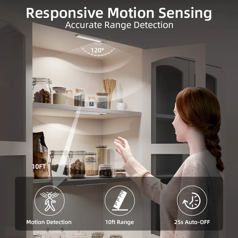 ·[Upgraded Motion Sensor & 4 Lighting Modes]: The under cabinet lights automatically turn on when movement is detected within a 10 ft / 120°range. In [Auto Day Mode], cabinet lights turn on anytime with motion, while [Auto Night Mode] activates only in dark environments. Plus, if no motion is detected after 20 seconds, the motion activated under cabinet lights will automatically shut off to conserve energy.