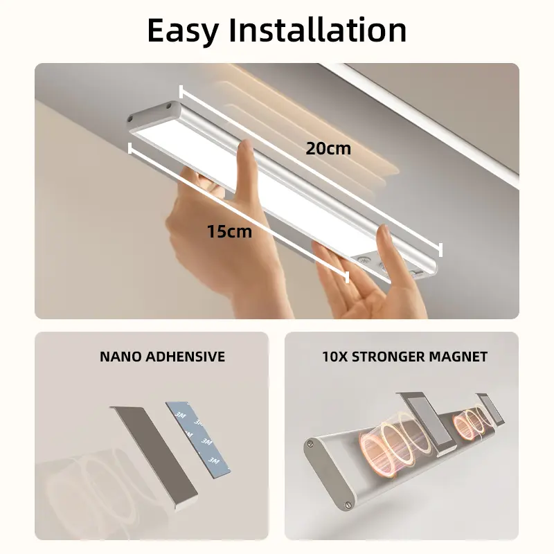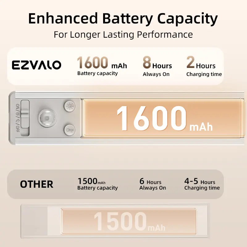 ·[1600mAh Larger Battery & Fast Charging]: These motion sensor under cabinet lights are equipped with a powerful 1600mAh battery, enjoy up to 6 hours of use in Always-On Mode at 100% brightness or 15-45 days in 2 AUTO Mode (depending on frequency). Our rechargeable under cabinet lights charge in just 2 hours—much faster than others. Ideal for under cabinet lighting wireless needs in your kitchen, cabinets, and closet.
