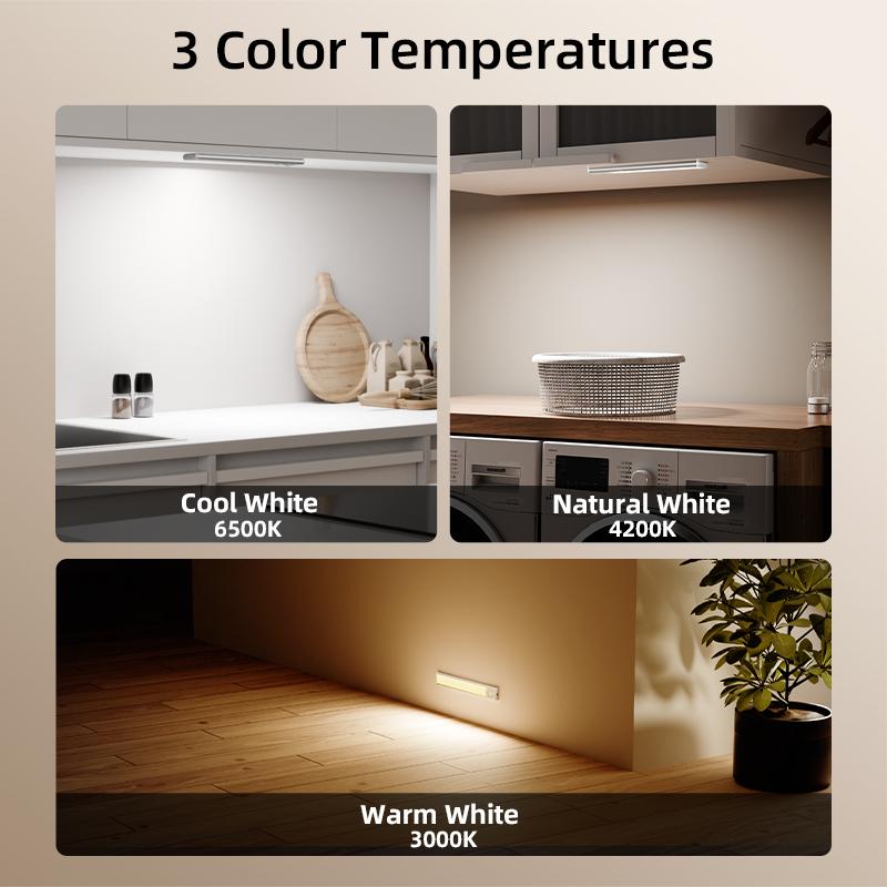 ·[3 Color Temps & Dimmable]: These closet lights support choose from 3 color temperatures: Warm Light (3000K), Natural Light (4200K), and Cool White (6500K) to meet your lighting needs in different scenarios. These under counter lights for kitchen offer 3 brightness levels, allowing you to easily brighten them for tasks like meal preparation or dim them as the motion sensor night light without waking others at midnight.