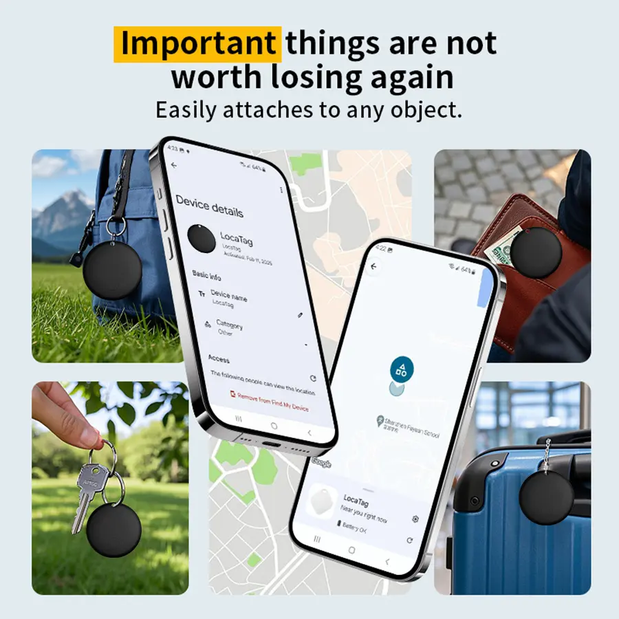 ·Compact & Versatile Mounting: Lightweight and portable. Easily and securely attaches to keychains, backpack zippers, luggage handles, inside wallets, remote controls, or any item you need to track.
