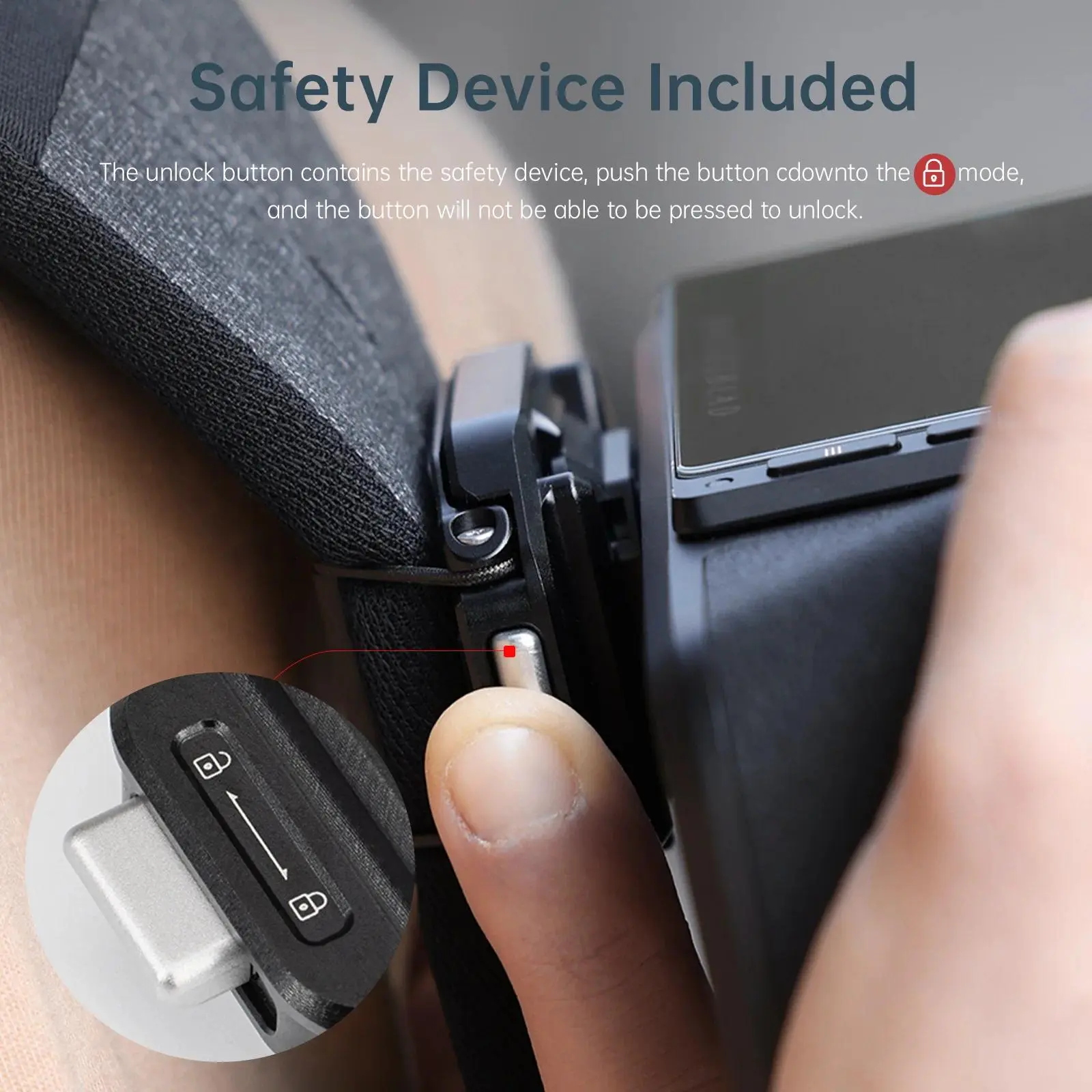 The unlock button contains the safety device, push the button down to the mode, and the button will not be able to be pressed to unlock.