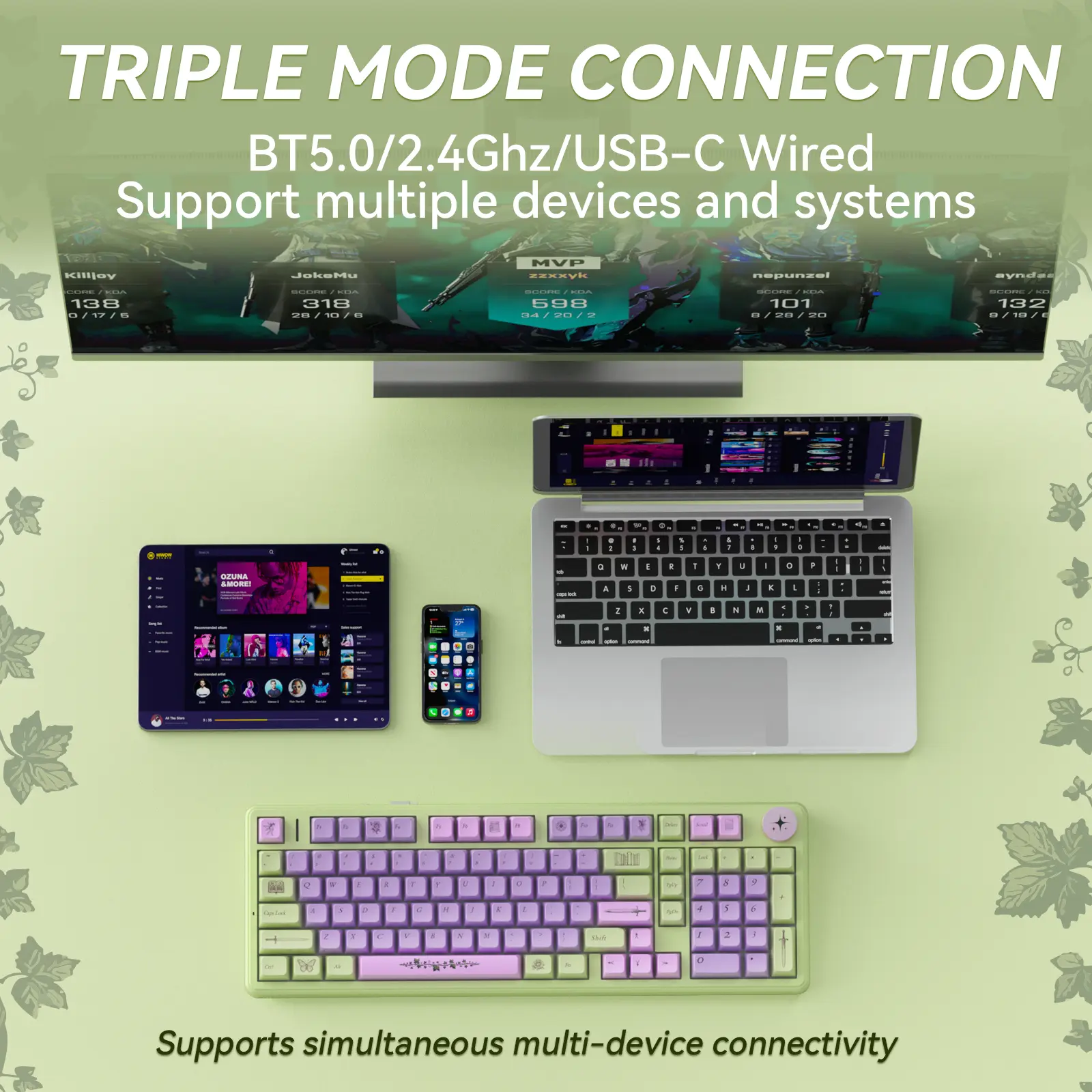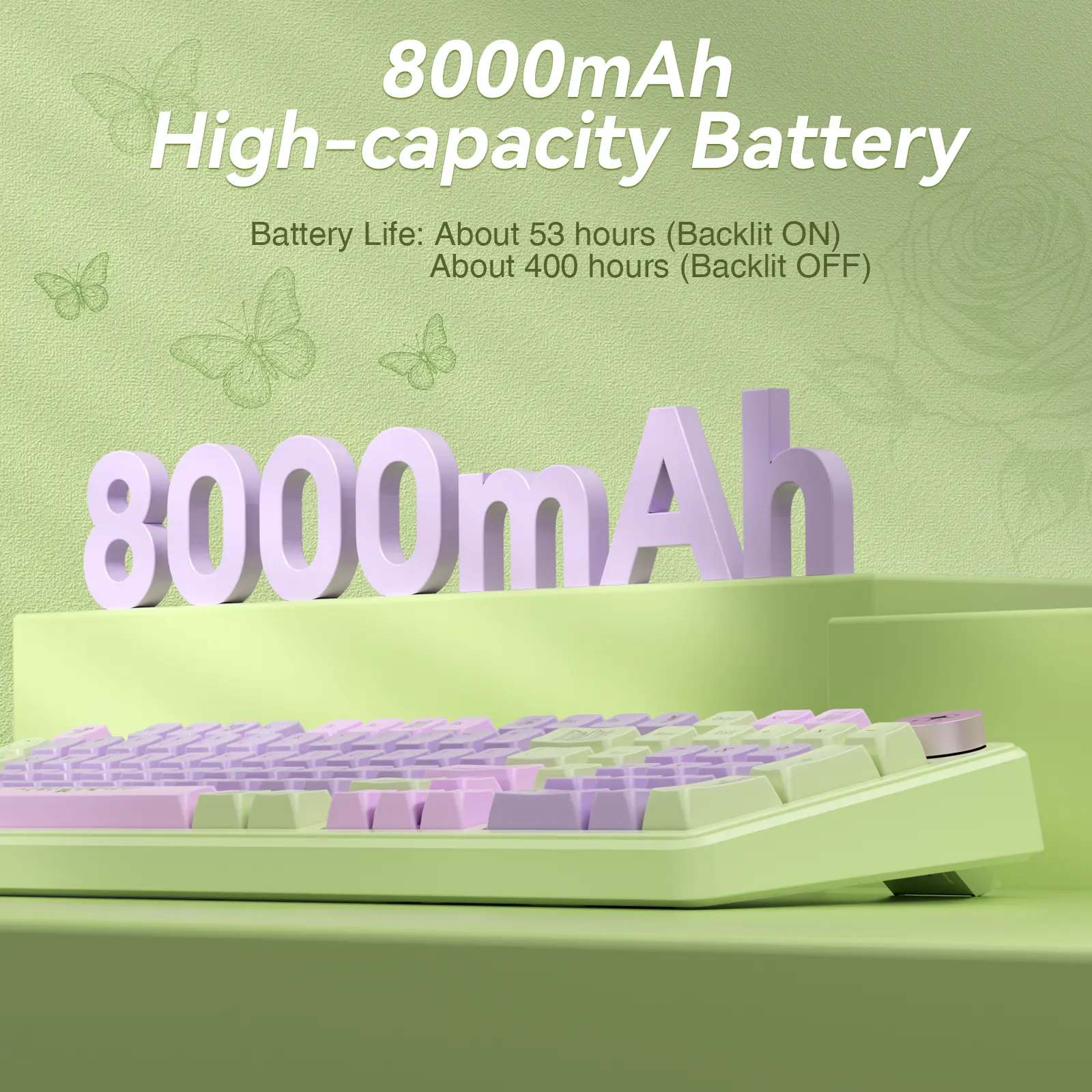 ·Tri-mode Connection Keyboard: AULA F99 Pro wireless mechanical keyboards work with Bluetooth, 2.4GHz wireless and USB wired connection, can connect up to five devices at the same time, and easily switch by shortcut keys or side button. F99 Pro computer keyboard is suitable for PC, laptops, tablets, mobile phones, PS, XBOX etc, to meet all the needs of users. In addition, the rechargeable keyboard is equipped with a 8000mAh large-capacity battery, which has long-lasting battery life