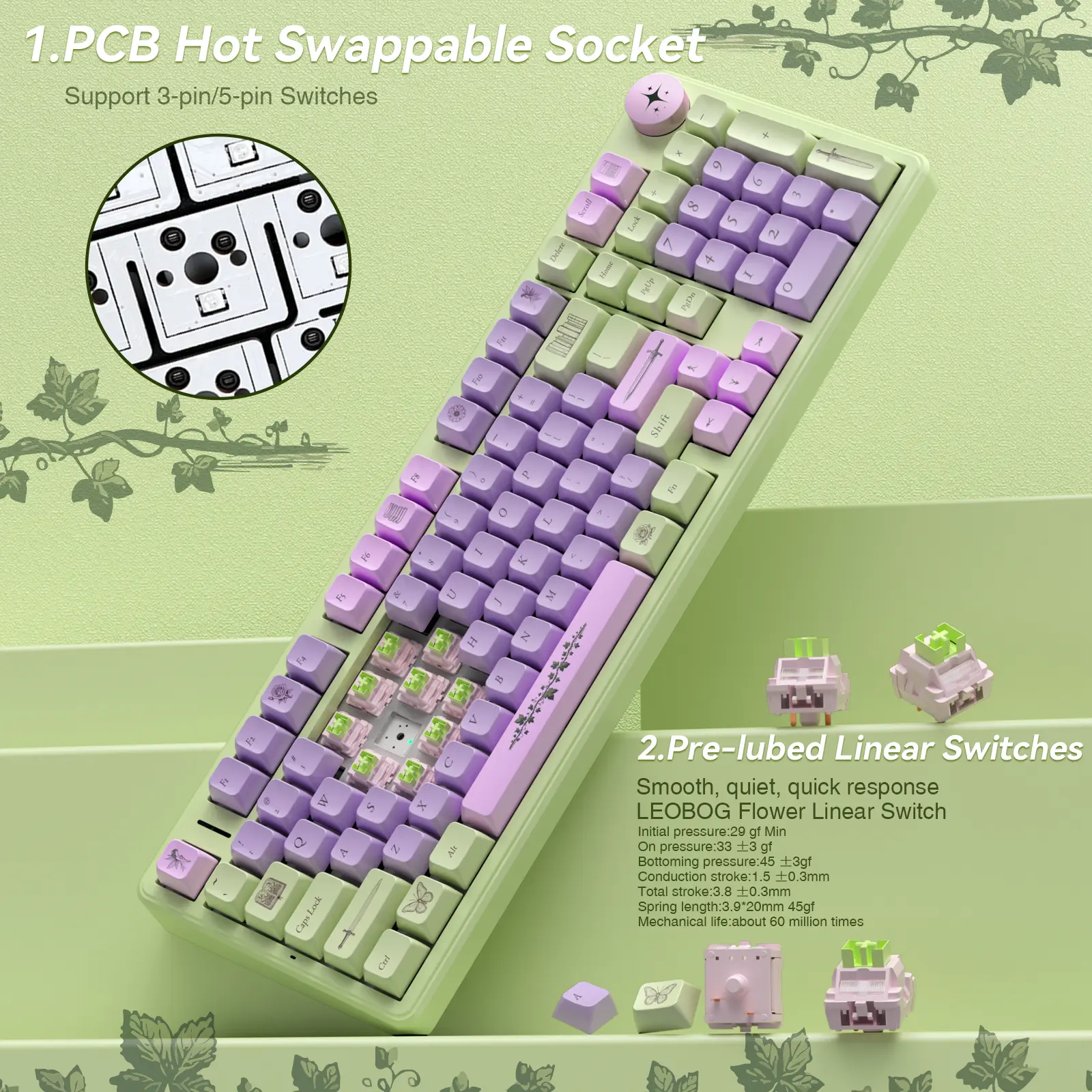 ·Hot-swap Custom Keyboard: This custom mechanical keyboard with hot-swappable base supports 3-pin or 5-pin switches replacement. Even keyboard beginners can easily DIY there own keyboards without soldering issue. F99 Pro gaming keyboards equipped with pre-lubricated stabilizers and LEOBOG Flower switches, bring smooth typing feeling and pleasant creamy mechanical sound, provide fast response for exciting game