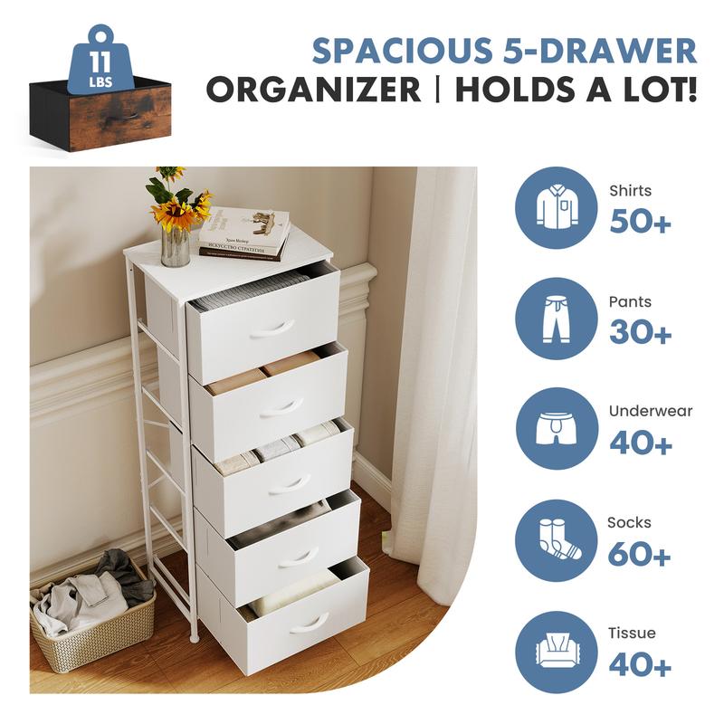 ·【Excellent Storage Capacity】Bedroom dresser with 5 drawers provides plenty of storage space, which can classify your messy items as your need; The wooden table top with good load-bearing performance provides a hard surface to place lamps, books, decor, and more.
