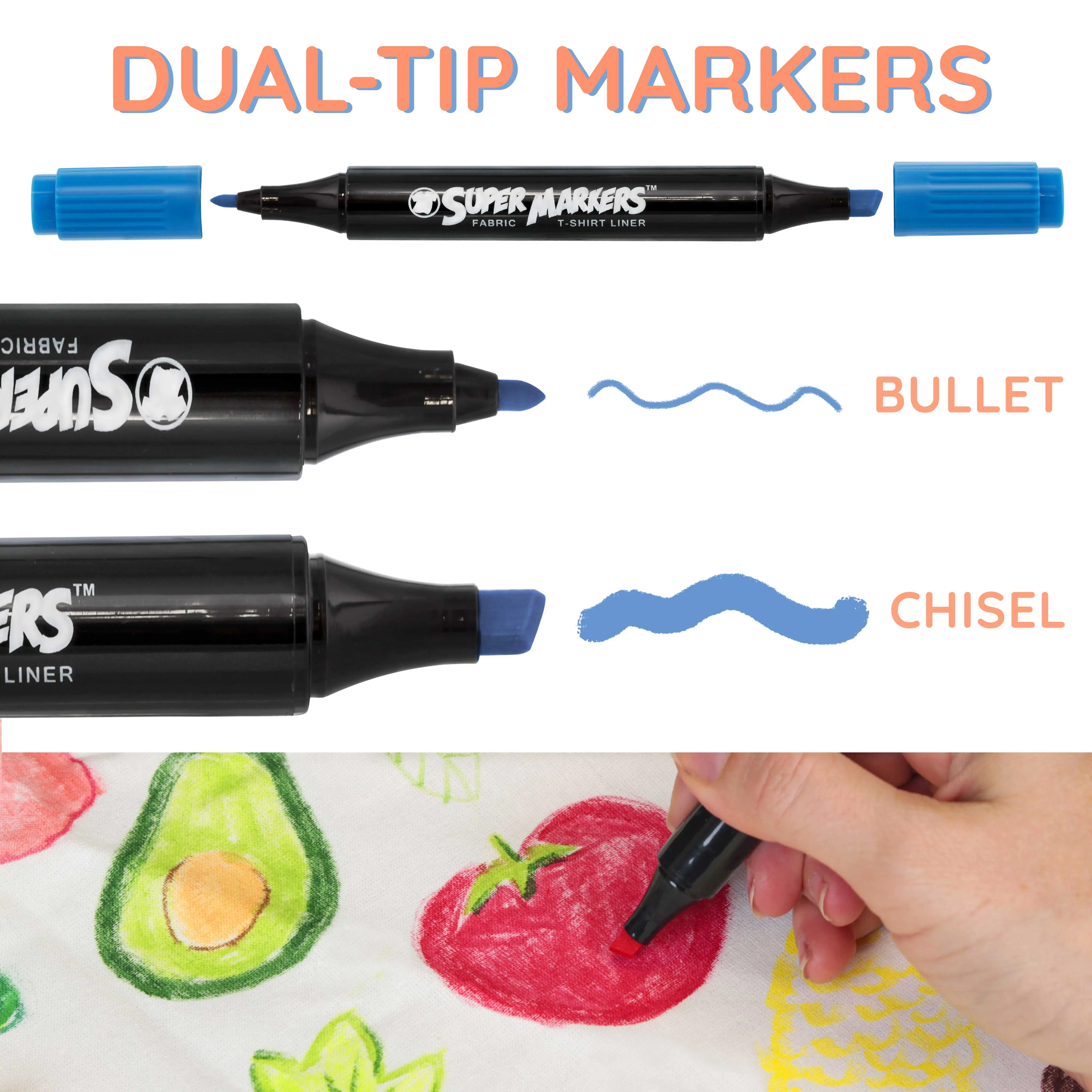 ·Bullet and Chisel Tips: Professional artist-quality double-ended fabric markers that provide fine detail lines, bullets, and broad chisel strokes. The fine bullet tip provides accurate line control for outlining, writing, and sketching, and the chisel tip is great for broad writing, filling in, shading, and blending.