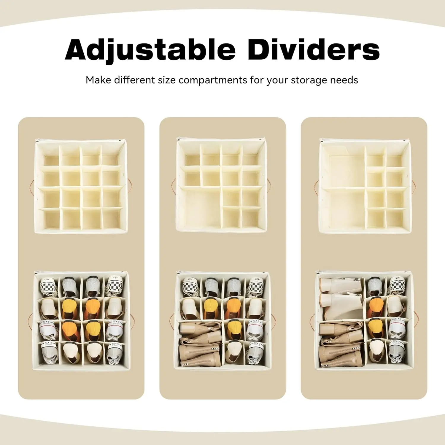 ·CUSTOMIZABLE COMPARTMENTS: The shoe boxes’ unique slot system allows for easy assembly and customizable storage solutions. The dividers for shoes organizer can be adjusted to fit shoe sizes, ensuring a dedicated spot for each pair and maximizing closet storage space