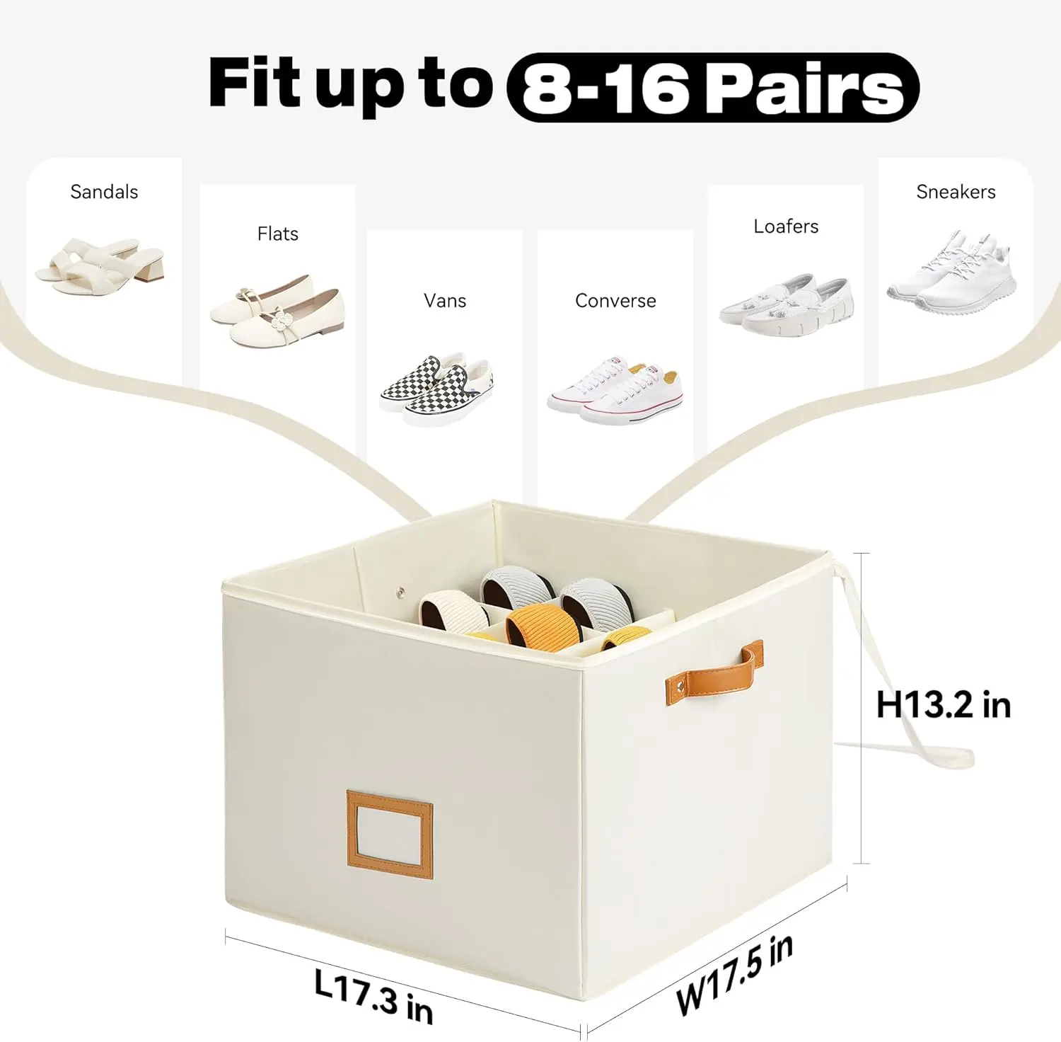 ·COMPACT SHOE ORGANIZATION: Maximize your closet space with our shoe storage organizer, large enough to store 8-16 pairs of footwear like sandals, slippers, and sneakers in a neatly compact size of 17.3"x17.5"x13.2"(44x44.5x33.5cm) with 16 individual compartments. Its foldable design makes it ideal for space-saving when not in use and is perfect for homes, dorms, and seasonal footwear, ensuring your shoes stay dust-free and organized