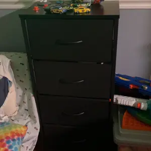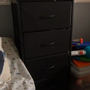 There are black stains on the front of two of the drawers that I can't wipe off. Other than the stains and material I like the dresser.