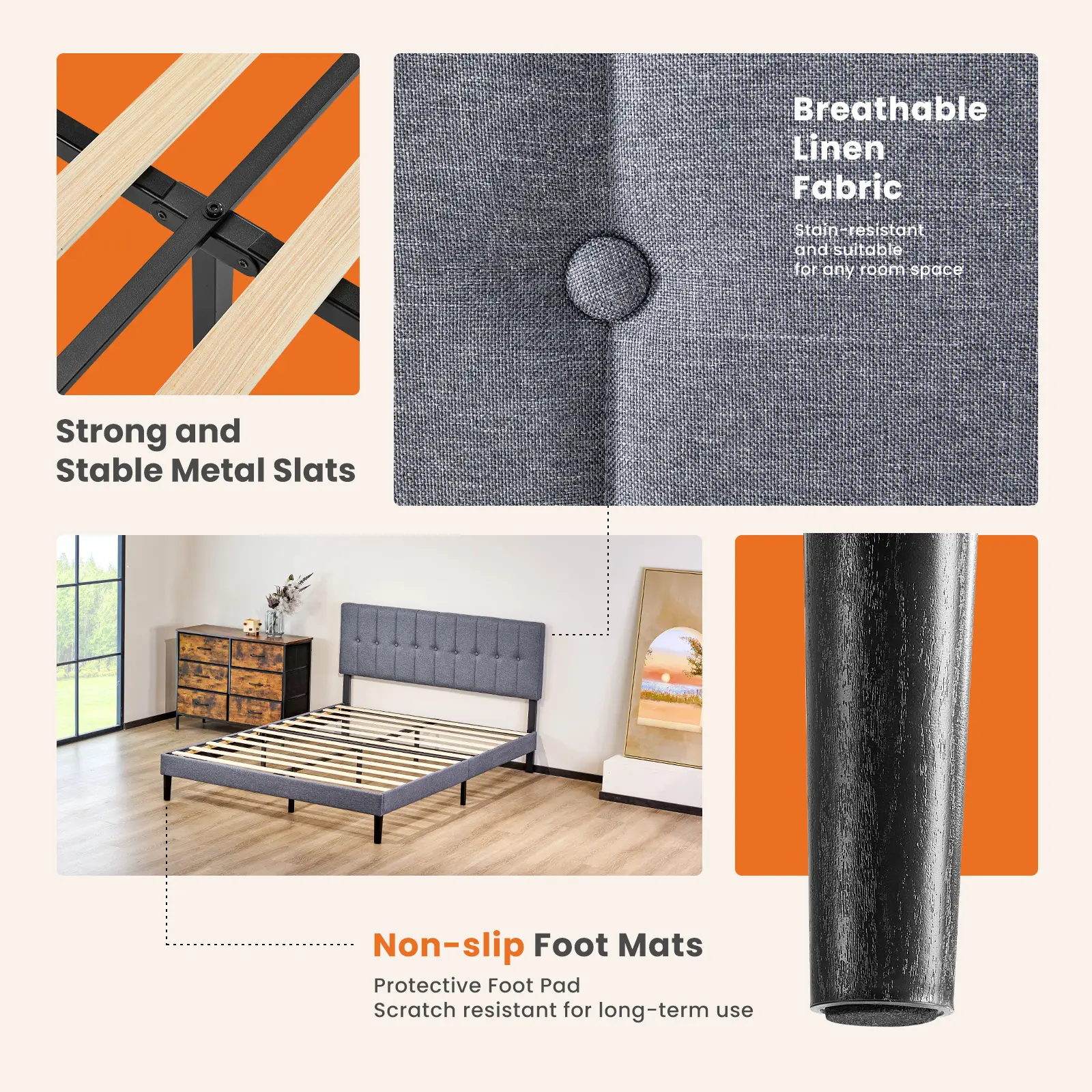 ·No box Spring Needed: Heavy-duty steel slats provide exceptional support and stability for any mattress type, eliminating the need for a costly box spring. Save money without sacrificing comfort or durability.