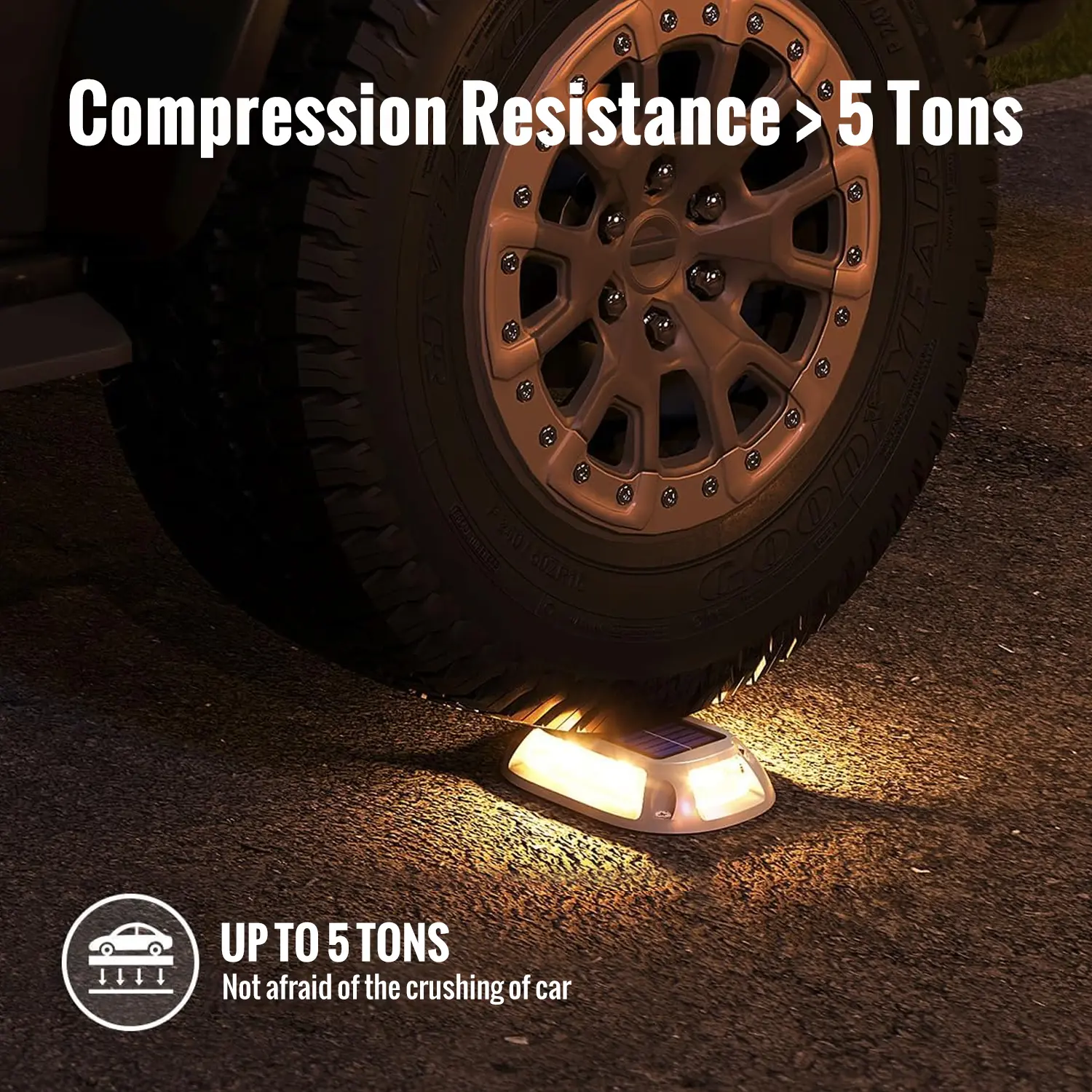 💧 Built Tough for All Seasons: Crafted from premium aluminum alloy, each light is tested to withstand up to 5 tons of pressure — tough enough for cars, bikes, even small boats. With an IP68 waterproof rating, these solar lights perform reliably in rain, snow, heat, or frost.