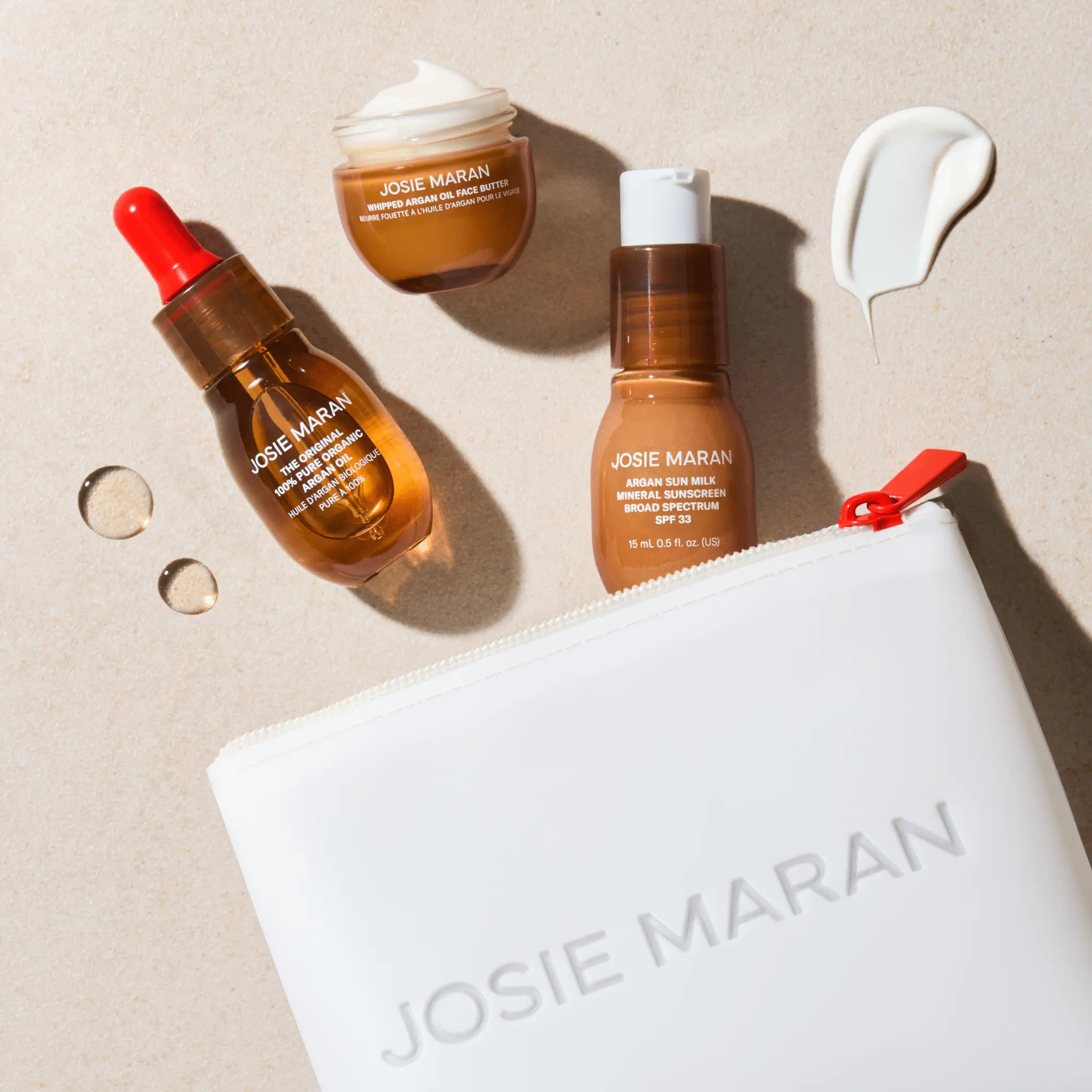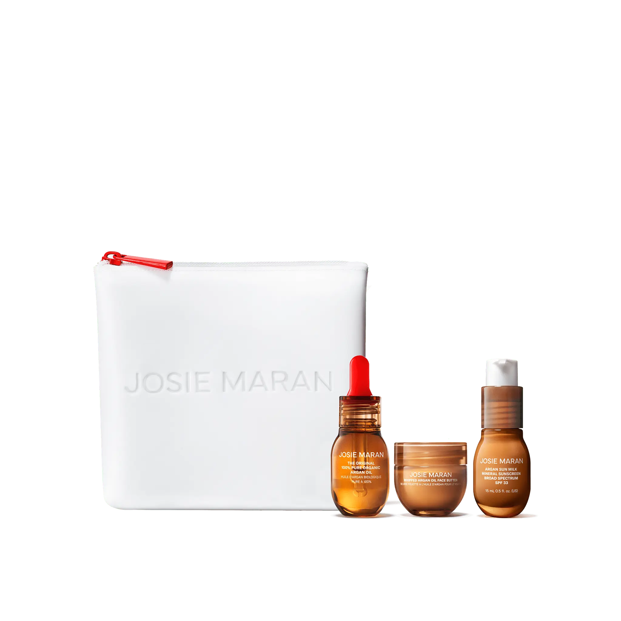 Your favorite skin ritual—mini but mighty. This travel-sized trio stars our signature 100% Pure Organic Argan Oil, ultra-nourishing Whipped Face Butter, and super sheer Sun Milk SPF 33 for a hydrating, firming, and glow-boosting ritual you can pack in a pinch. Wherever life takes you, your skincare favorites are coming too