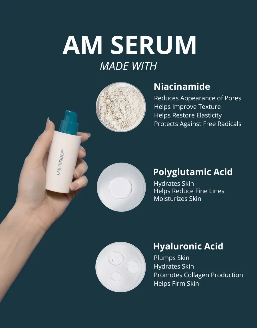 AM Serum (15% Active Clinical Complex) | MORNING GLOW The first of your two-step routine, the AM Serum is comprised of 10% Niacinamide and active levels of Polyglutamic Acid and Hyaluronic Acid. When evenly applied all over, the serum provides a glass-like effect and immediate, intense hydration to start your day with the appearance of healthy, luminous skin.