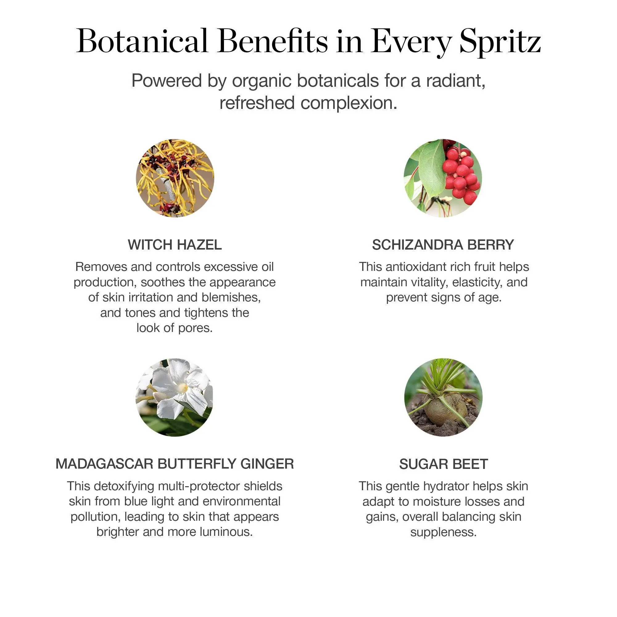| Ingredients | Aloe Barbadensis Leaf Juice*, Glycerin* (from Vegetable Sources), Propanediol (from Corn), Betaine (from Sugar Beets), Hamamelis Virginiana (Witch Hazel) Water*, Glycerin (from Vegetable Sources), Pentylene Glycol (from Vegetable Sources), Decyl Glucoside (from Sugar), Phenethyl Alcohol (from Pandanus Trees), Sodium Gluconate (from Vegetable Sources), Lauryl Glucoside (from Vegetable Sources), Alcohol* (from Sugarcane), Camellia Sinensis (Green Tea) Leaf Extract*, Arginine (from Vegetable Sources), Hedychium Coronarium (Butterfly Ginger) Root Extract, Lavandula Angustifolia (Lavender) Flower/Leaf/Stem Extract, Rose Extract, Citric Acid (from Citrus Fruits), Schisandra Chinensis (Five Flavor Fruit) Extract, Anthemis Nobilis (Chamomile) Flower Extract, Camellia Sinensis (Green Teal) Leaf Extract, Eucalyptus Globulus Leaf Extract, Mentha Viridis (Spearmint) Extract, Pogostemon Cablin (Patchouli) Oil, Citrus Aurantium Amara (Bitter Orange) Flower Extract, Cucumis Melo Cantalupensis (Cantaloupe) Fruit Extract, Jasminum Officinale (Jasmine) Flower/Leaf Extract, Pyrus Malus (Apple) Fruit Extract, Rubus Idaeus (Raspberry) Fruit Extract, Theobroma Cacao (Cocoa) Seed Extract, Hydrolyzed Linseed Extract, Bioflavonoids (from Newcastle Hawthorne), Simmondsia Chinensis (Jojoba) Seed Oil*, Spiraea Ulmaria (Meadowsweet) Extract, Sodium Benzoate, Nelumbo Nucifera (Pink Lotus) Flower Extract, Nymphaea Caerulea (Blue Lotus) Flower Extract. *Certified Organic Ingredient |