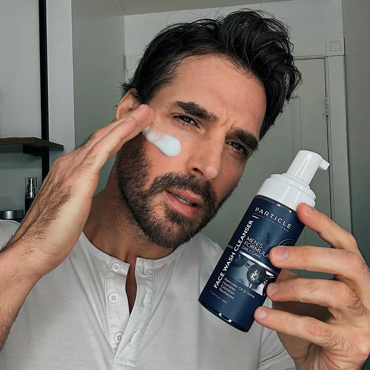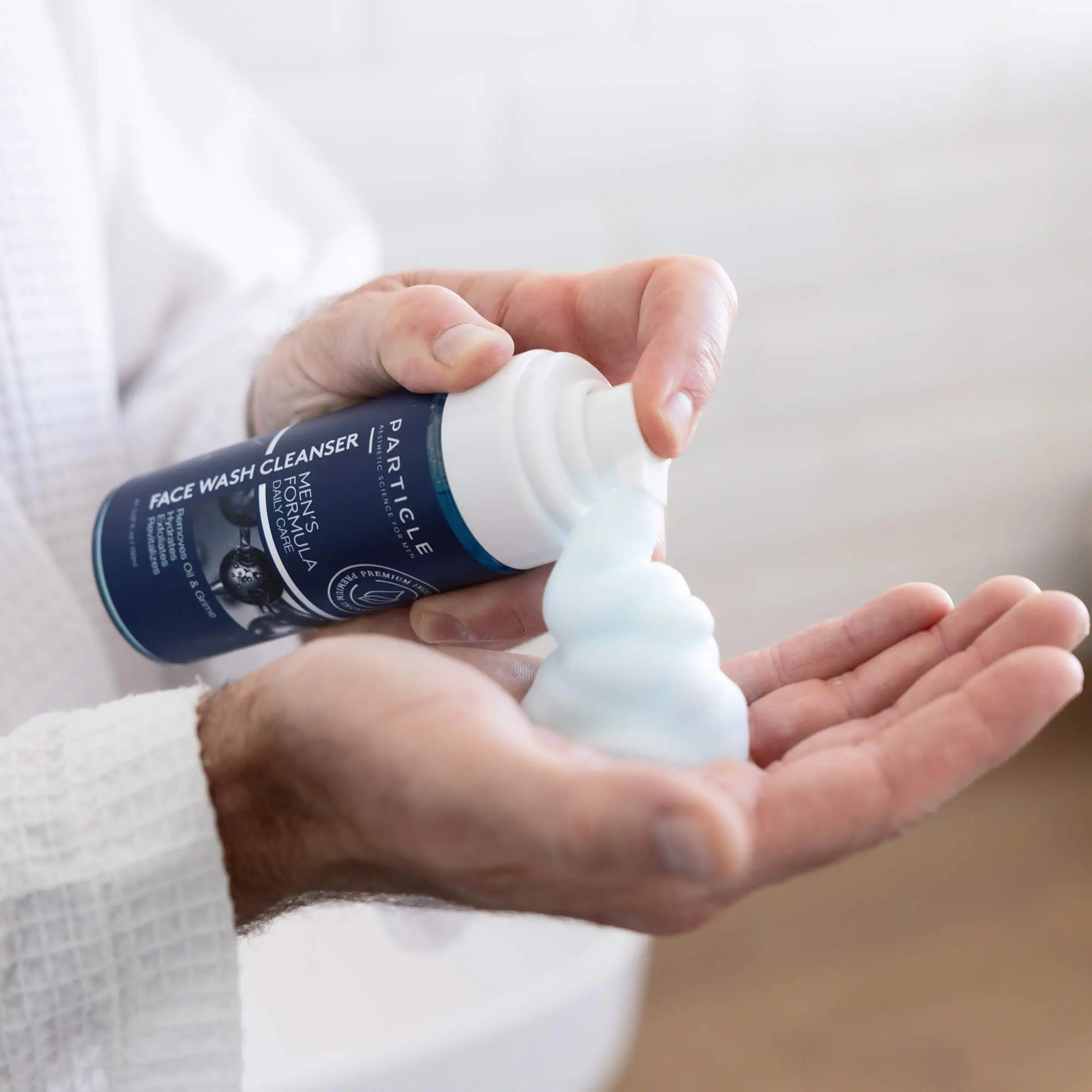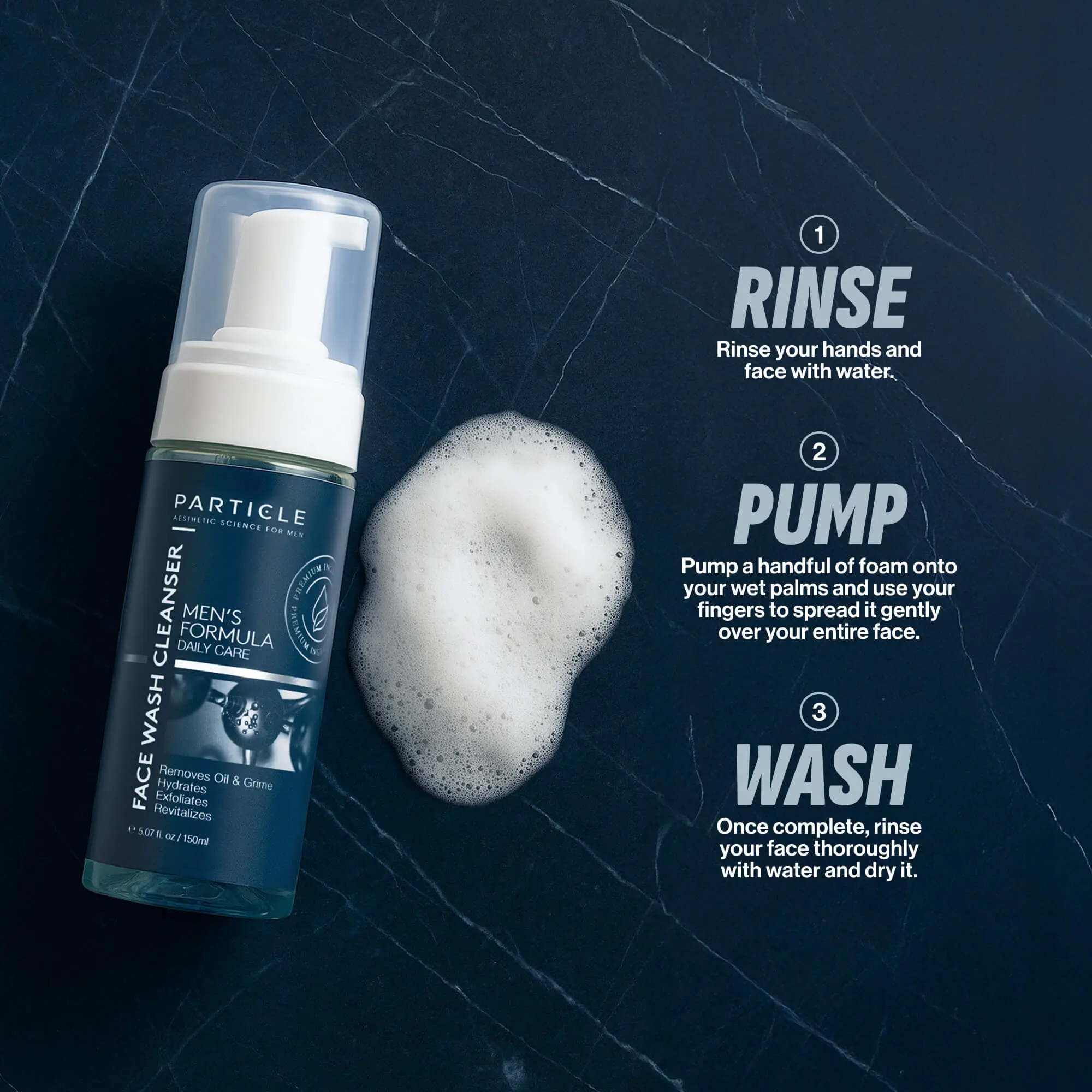 2. Apply Cleanser: Squeeze a small amount of Particle Face Wash into your hands and create a lather.