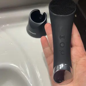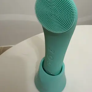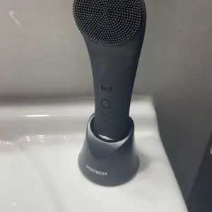 The face cleanser machine can be stored vertically. It features a unique pinhole charging port and non-slip pads. Water leakage at the bottom is designed for easy drainage.