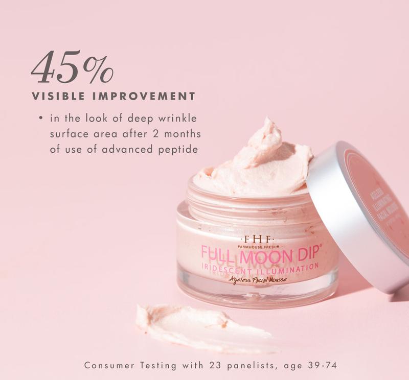 Fans say: “My skin looks so much better when I wear this iridescent moisturizer. I put it on in the morning before and sometimes without make-up. One of my favorites!" - Read more reviews below Nourishing results: Many retinol products cause redness and irritation. Not Full Moon Dip Facial Mousse! The unique time-release system of skin-nourishing pure form encapsulated retinol ensures it delivers softness, illumination, firmness and more – without the side effects normally associated with pure form retinol. Within weeks our advanced peptide visibly reduces the appearance of deep wrinkle surface area by up to 45% (female participants over 2 months using this magnificent peptide showed overwhelming success).  Caffeic acid from organic cucumber extract grown on our farm delivers antioxidants and nourishes your skin with vitamins and essential fatty acids. Use as an all-over daily moisturizer! Under makeup it brings a beautiful, youthful glow. Tap onto cheekbones and brow bones over your makeup for extra illumination! Your new complexion? Simply out of this world.
