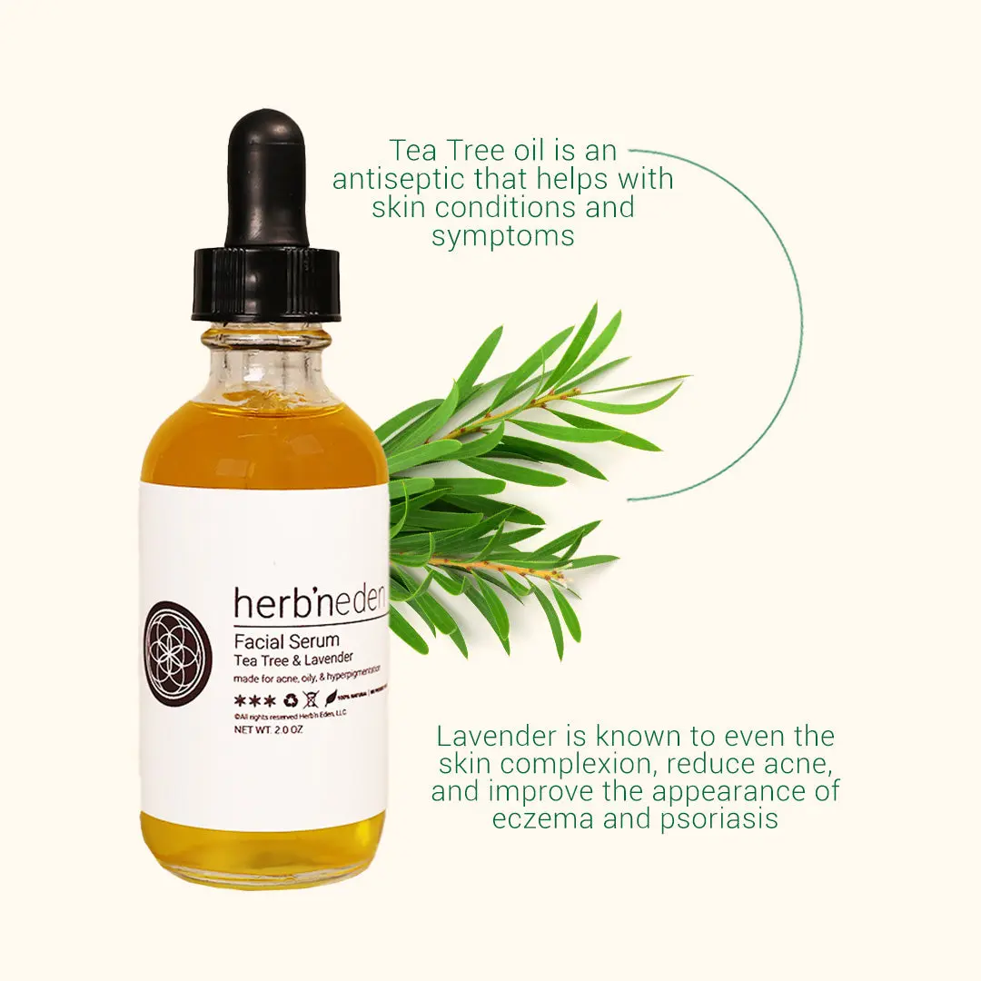 Our Tea Tree Lavender facial serum is ideal for acne, oily, and skin affected by hyperpigmentation. Tea tree oil is antiseptic and especially helpful to skin conditions and symptoms. By fighting away bacteria the oil combats dry skin, psoriasis, eczema, and acne.