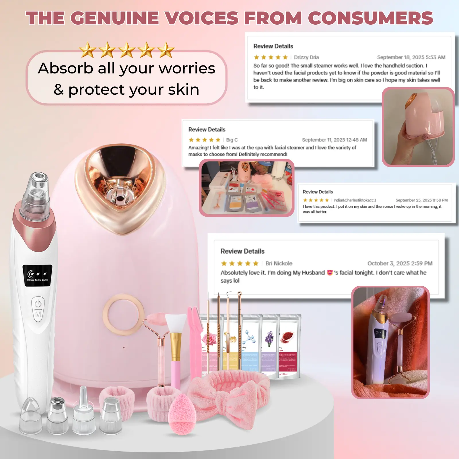 Very cool and useful, i wasn’t too sure how much water to add to the facial mixture so mine wasn’t like the pic 😂, the pore vacuum was ok for the price, the pimple extraction tools are perfect