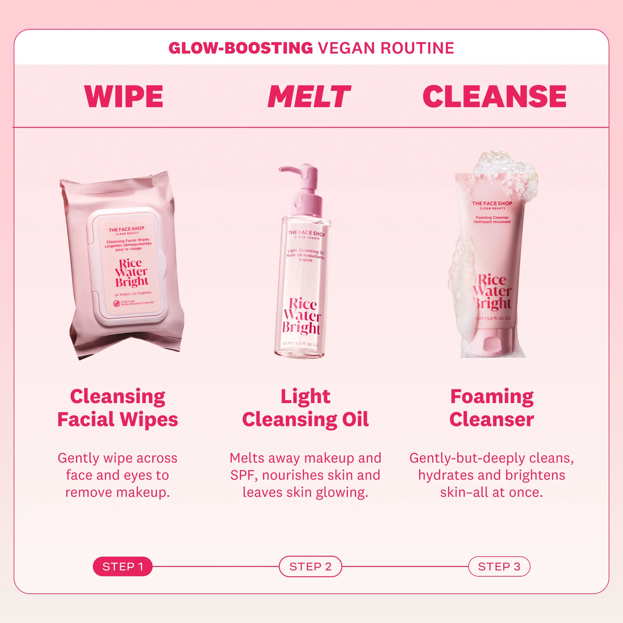 Wipe off, bright on! Refreshing and ready-to-go facial wipes infused with cleansing milk clean away oil and makeup, while powerhouse nutrients rice extract and rice bran oil help brighten and moisturize skin.
